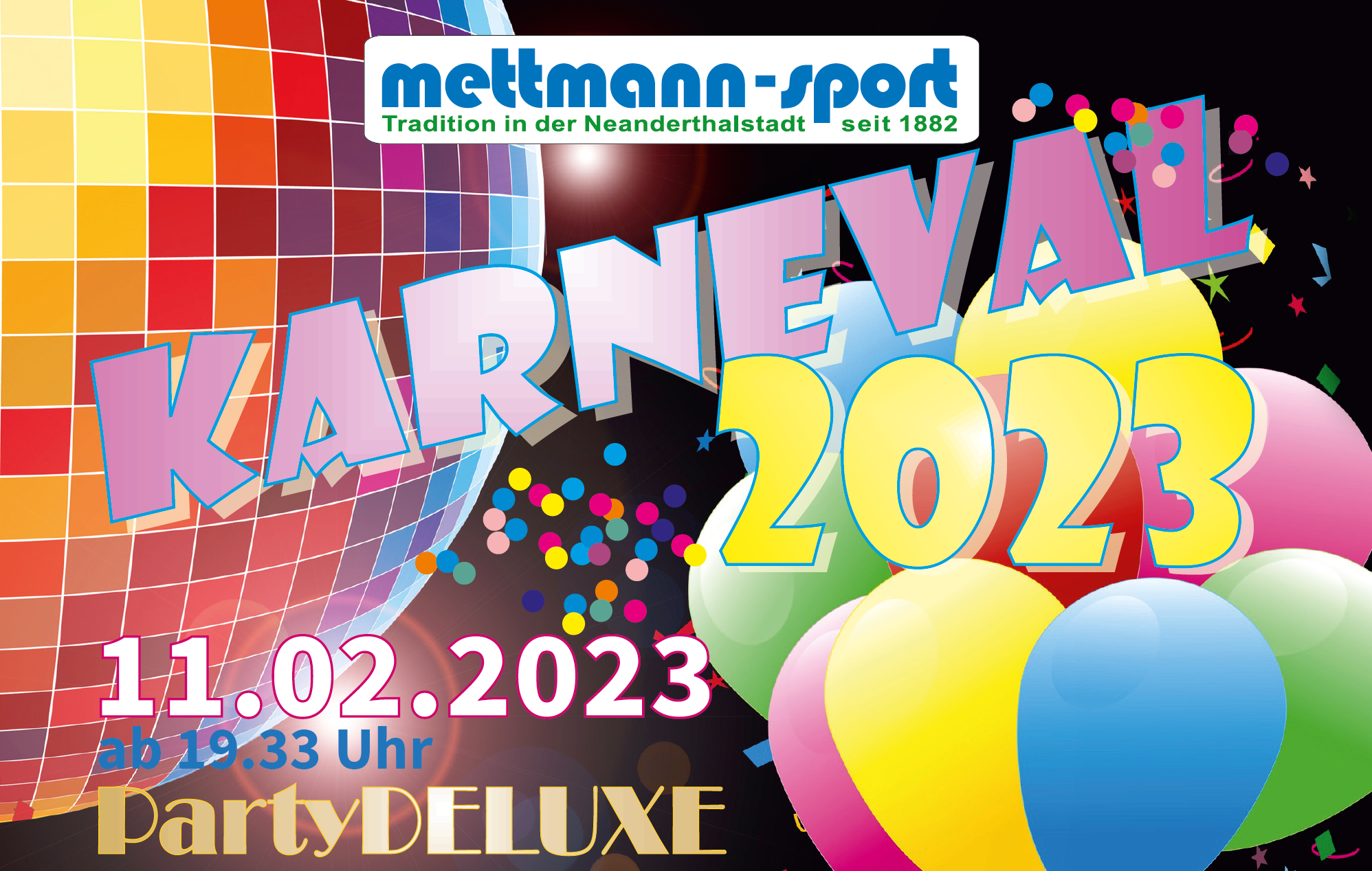 Am Sonntag, 08.12.2024, zwischen 10.00 Uhr und 11.30 Uhr startet der Ticketvorverkauf für die Party Deluxe 2025 in unserem me-sportSTUDIO (Schwarzbachstraße 8, 40822 Mettmann).