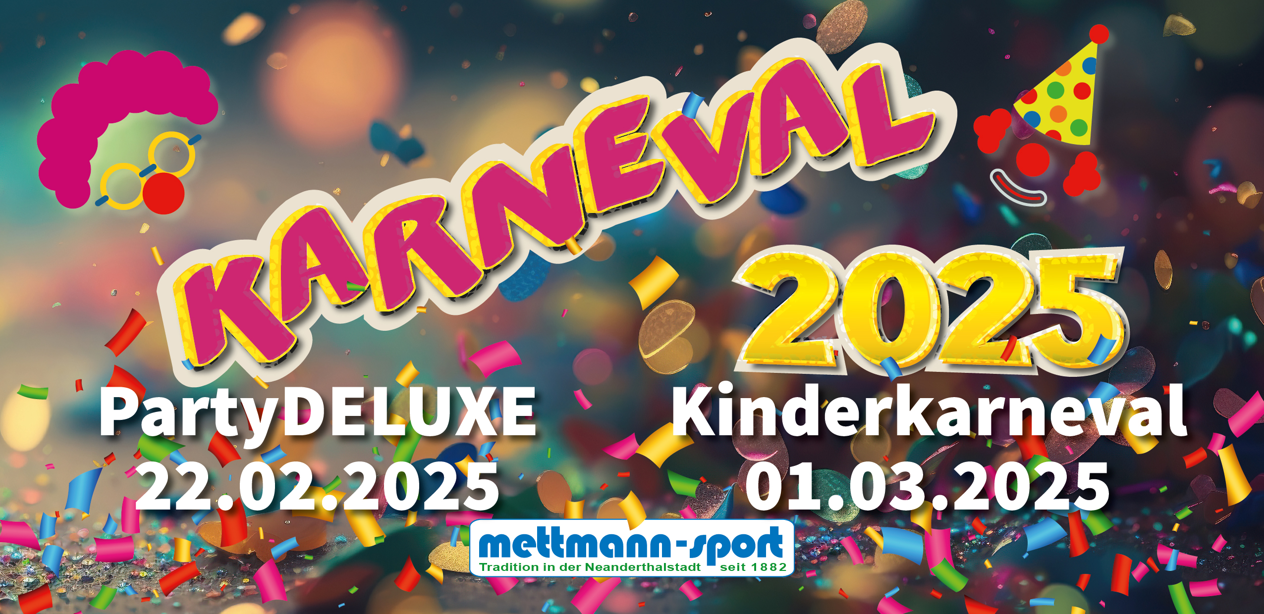 Karneval 2025 – Feiert mit uns auf der Party Deluxe für Erwachsene am 22.02.2025 in der Aula des HHG oder den Kinderkarneval in der Gustav-Bovensiepen-Turnhalle am 01.03.2025 nach dem Zug in Mettmann.