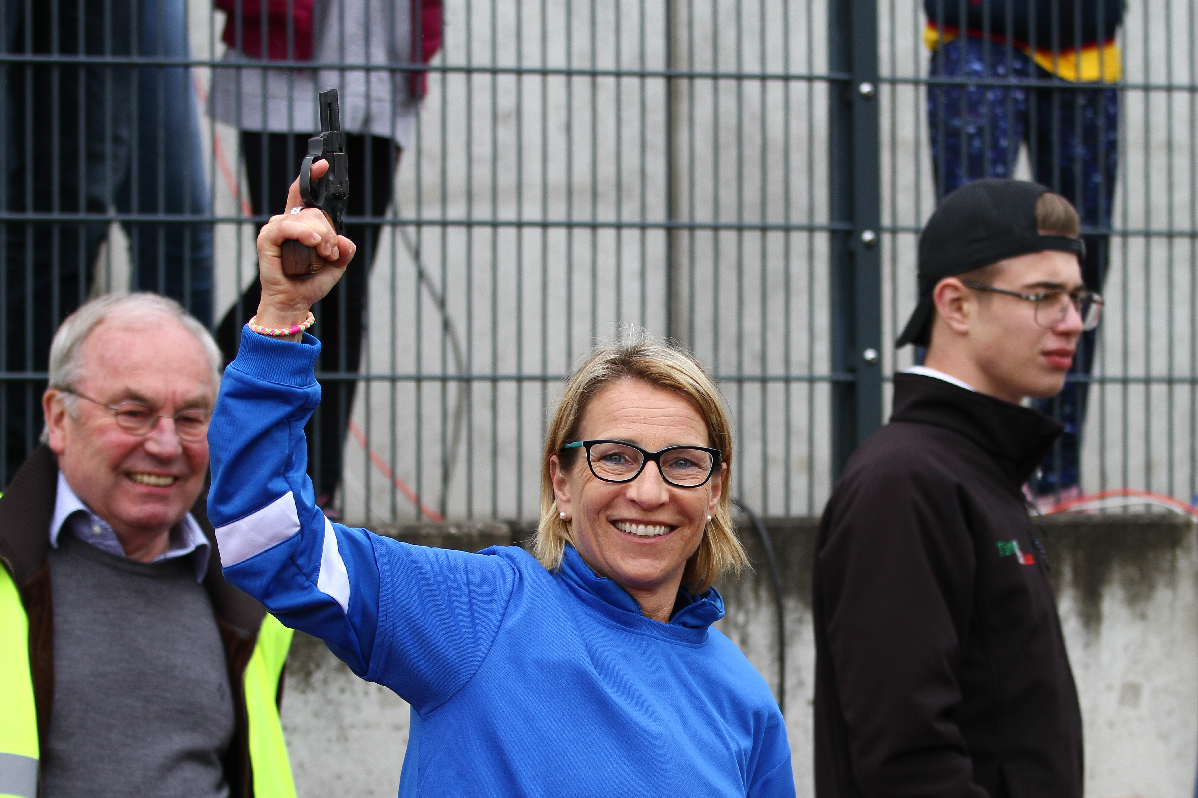 Lächelnde Frau in blauer Jacke hält eine Startpistole hoch, im Hintergrund ein älterer Mann und ein junger Mann. Download