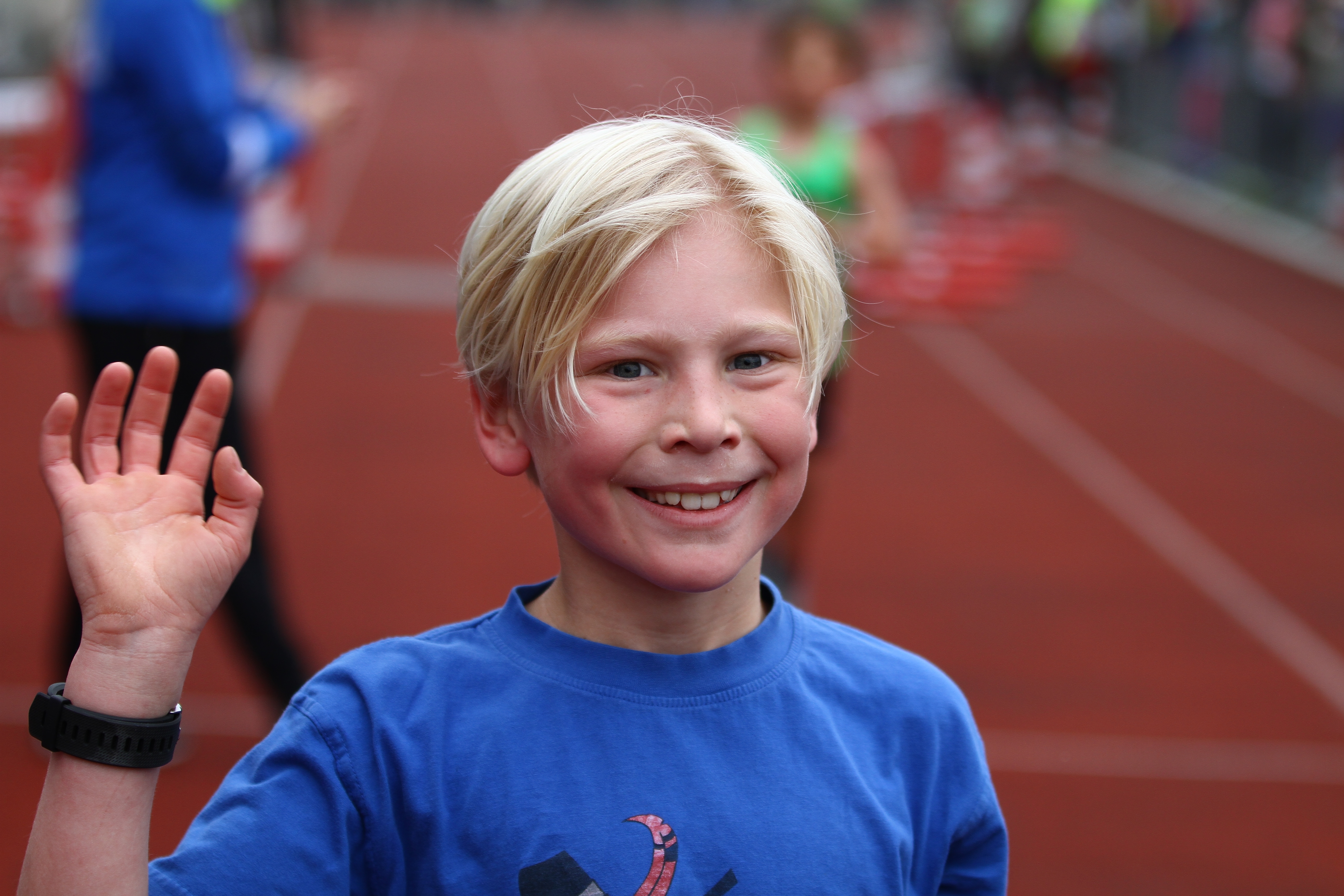 Lächelnder Junge mit blonden Haaren winkt auf einer Laufbahn während eines Sportevents. Download
