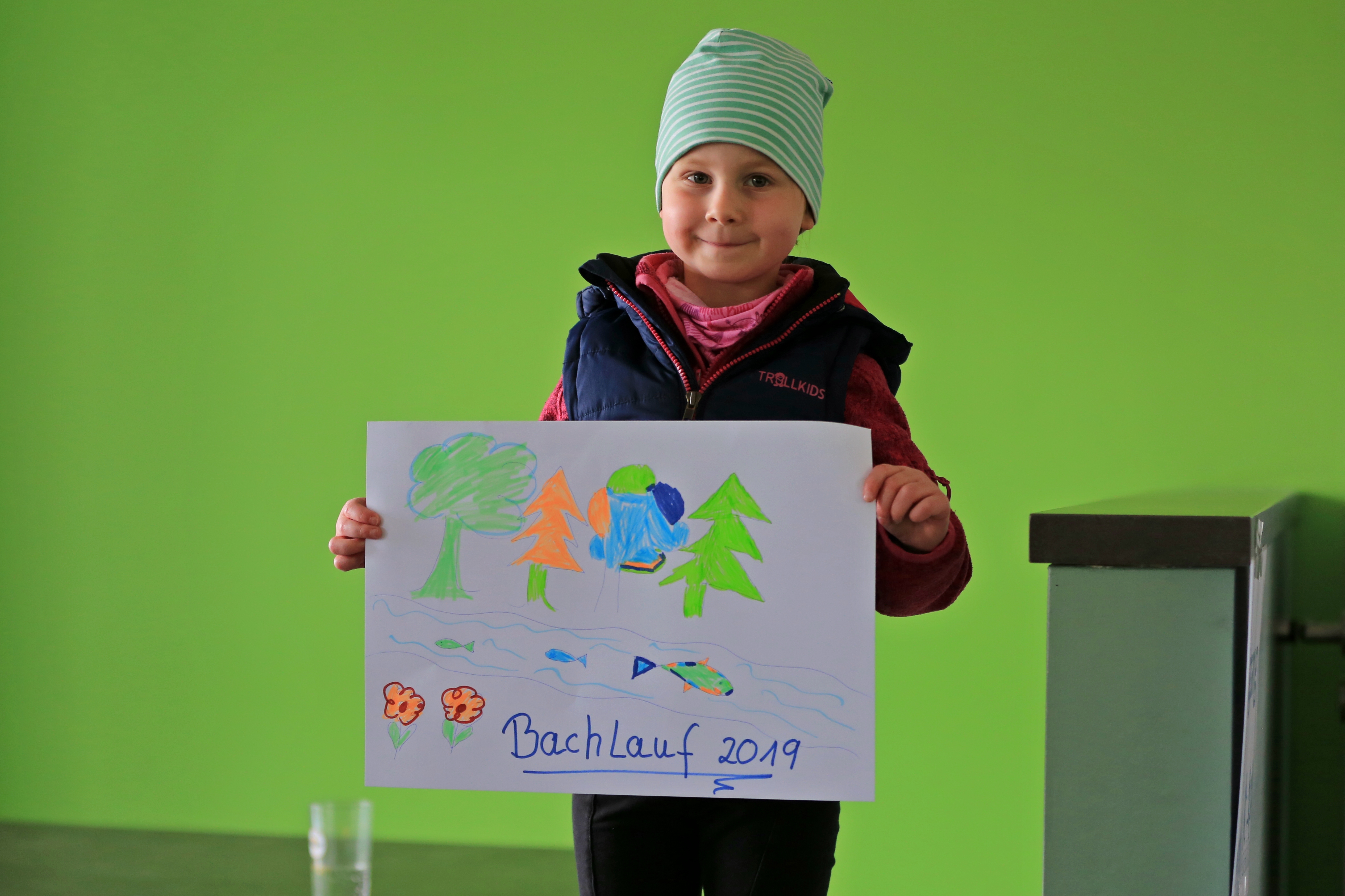 Kind mit Mütze hält ein buntes Plakat mit einer Landschaftszeichnung und der Aufschrift „Bachlauf 2019“, vor grüner Wand. Download