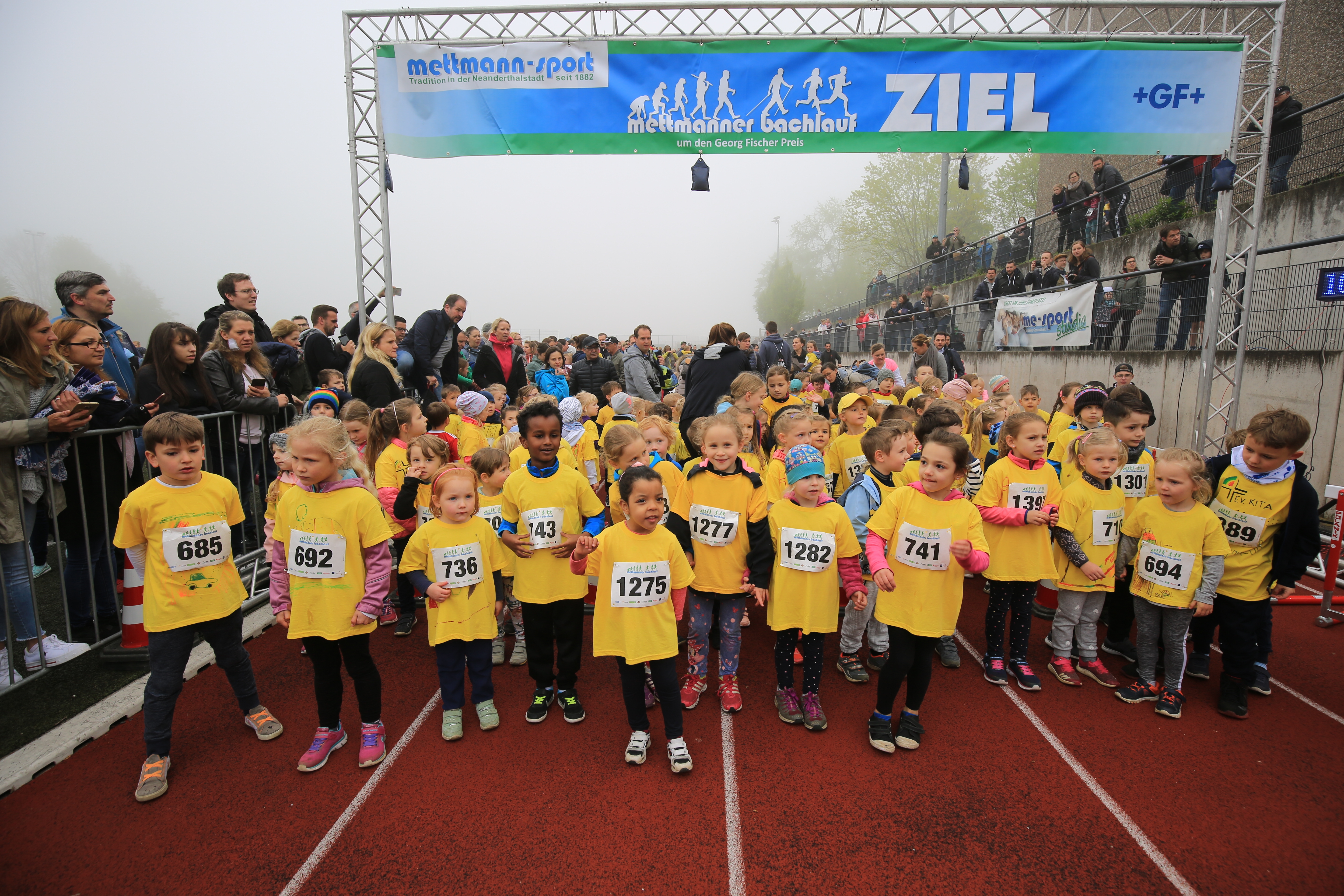 Mehrere Kinder in gelben T-Shirts mit Startnummern stehen auf einer Laufbahn, umgeben von Zuschauern und einer Wolkendecke. Download