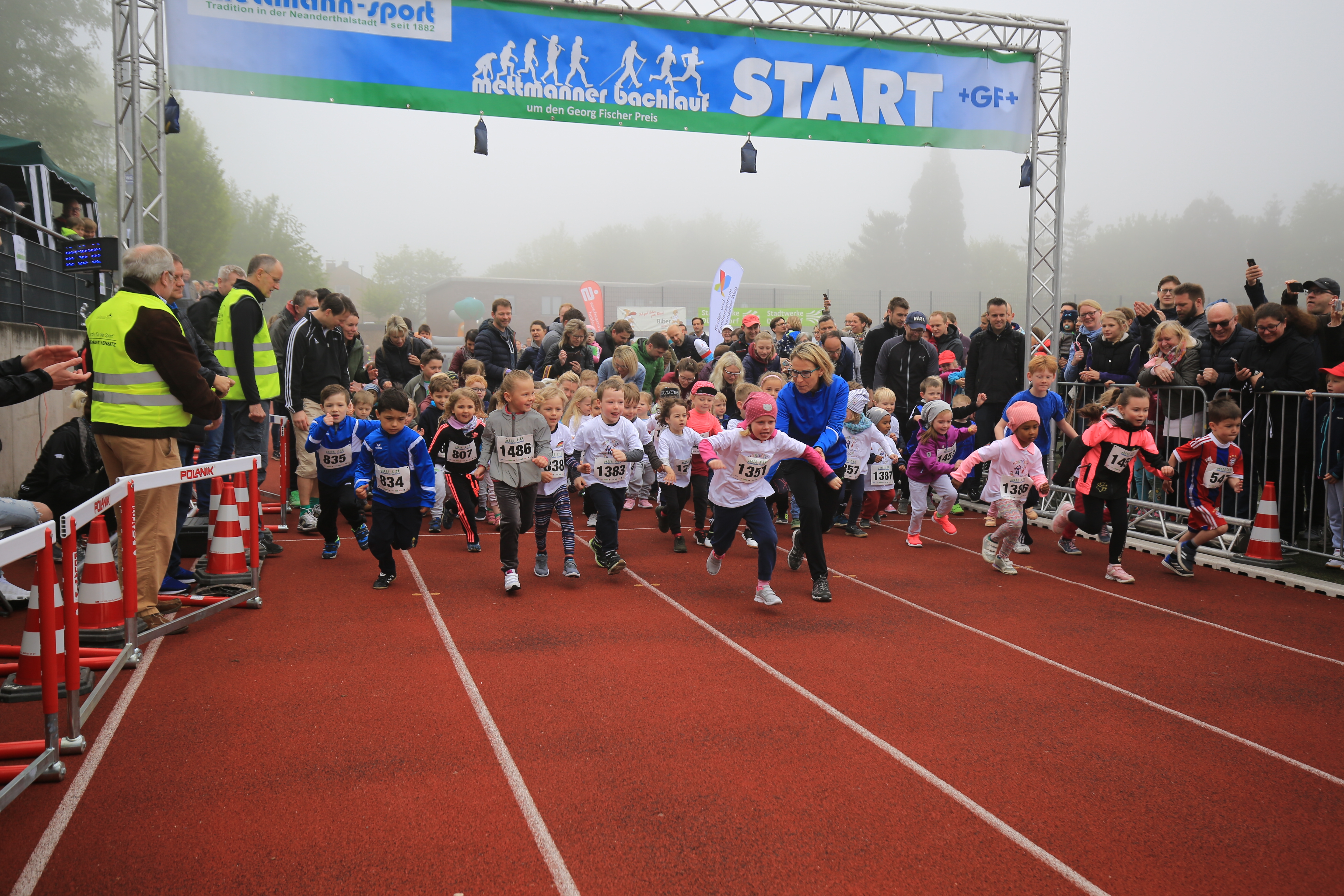 Startschuss für ein Kinderlauf-Event: zahlreiche Kinder sprinten auf einer roten Laufbahn, umgeben von Zuschauern. Download