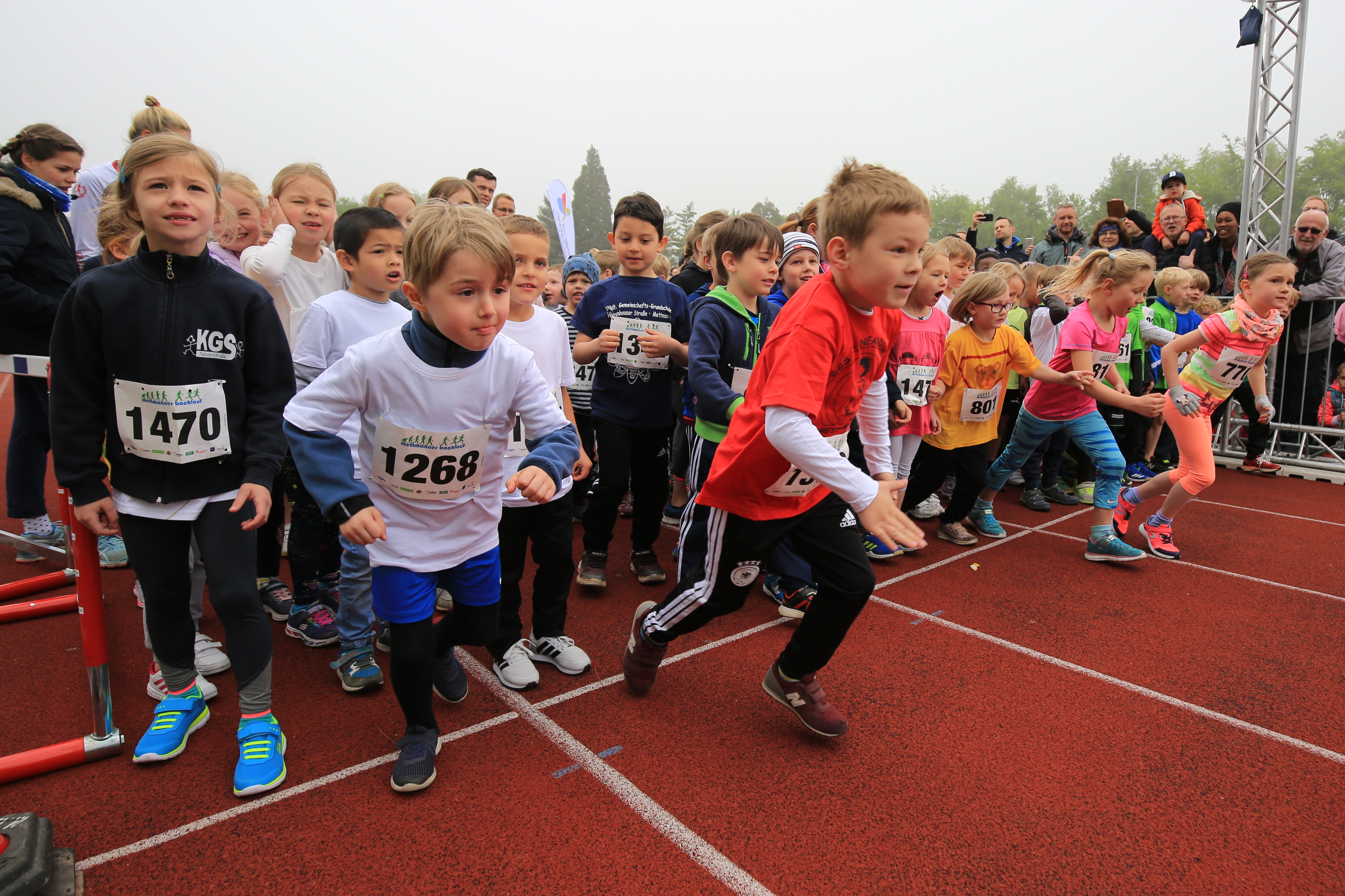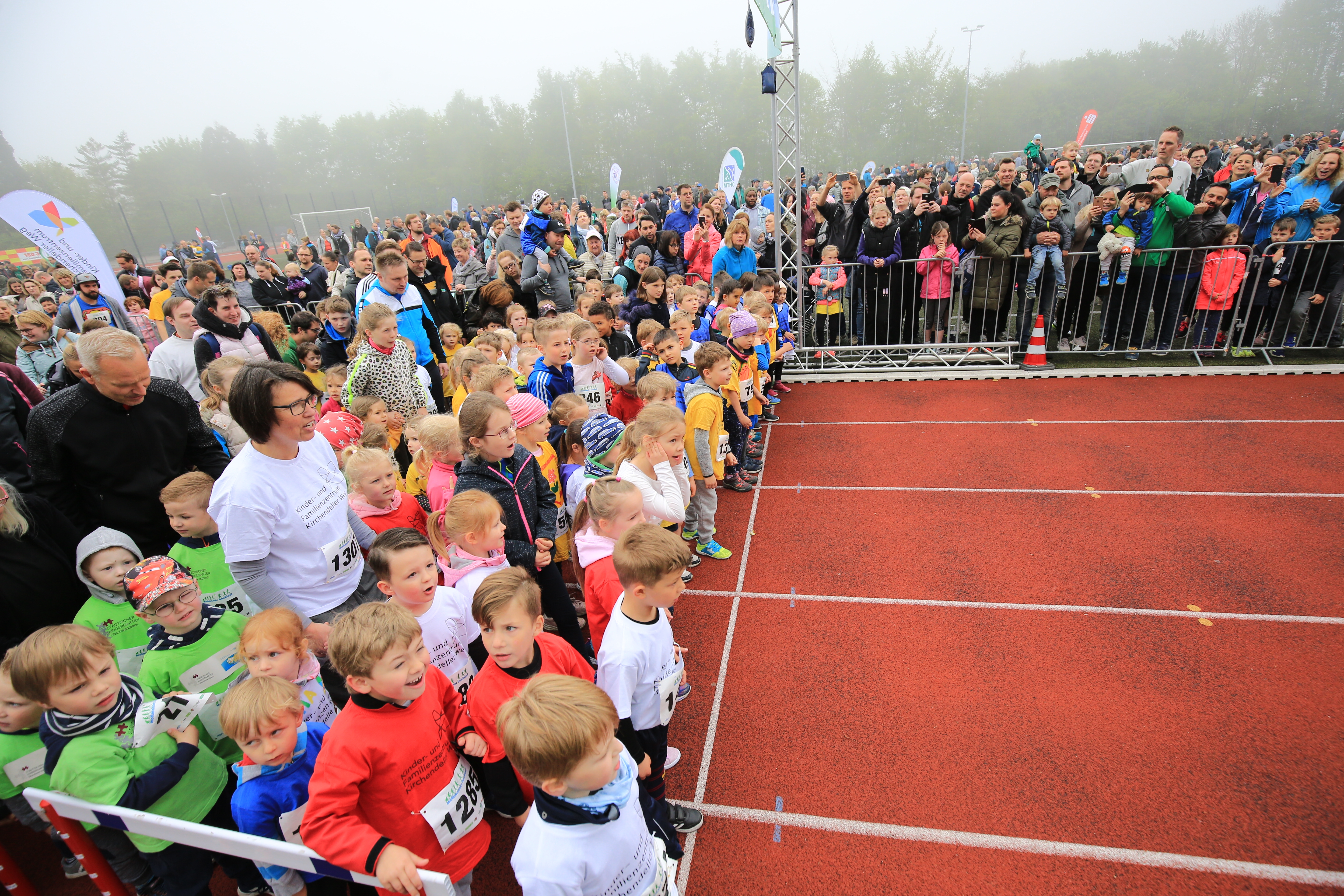 Kinder in bunten T-Shirts stehen an der Startlinie eines Rennens, während eine Menschenmenge sie anlachtet. Download