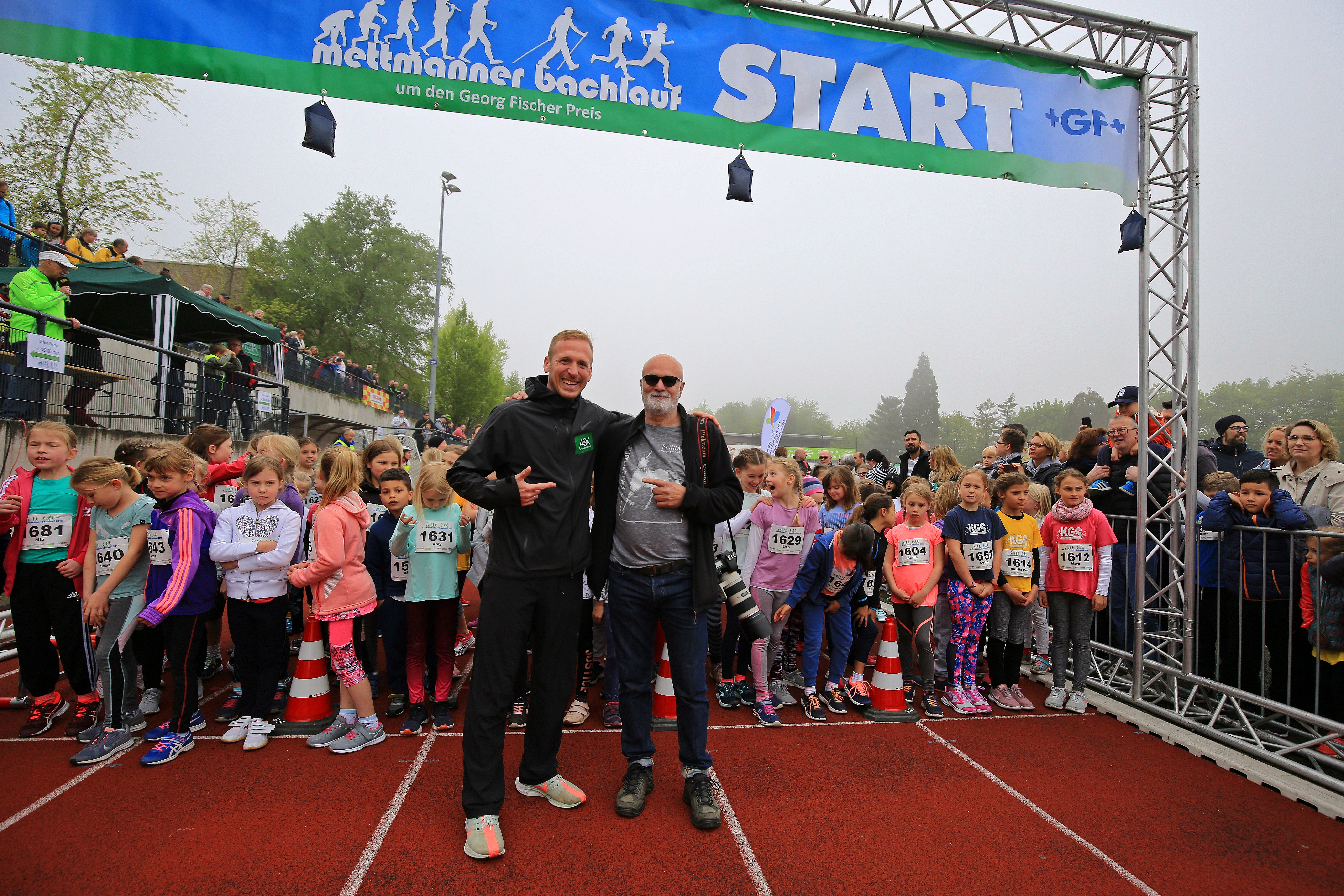 Zwei Männer posieren lächelnd vor einer Startlinie, während eine Gruppe von Kindern für ein Rennen aufgereiht steht. Download