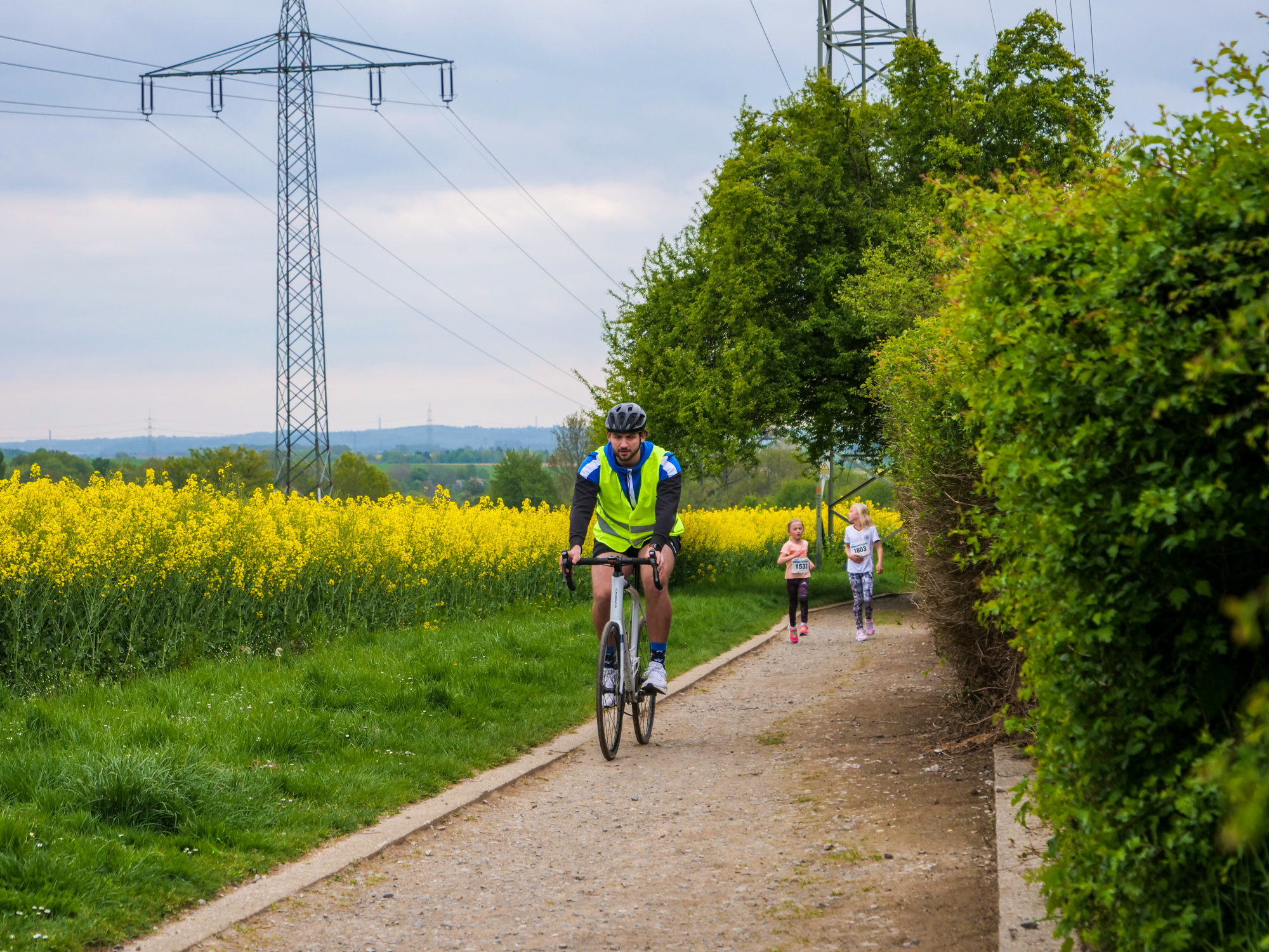Läufer in einem grünen Shirt winkt auf einem Weg, flankiert von Rapsfeldern und Radfahrer in Hintergrund. Download