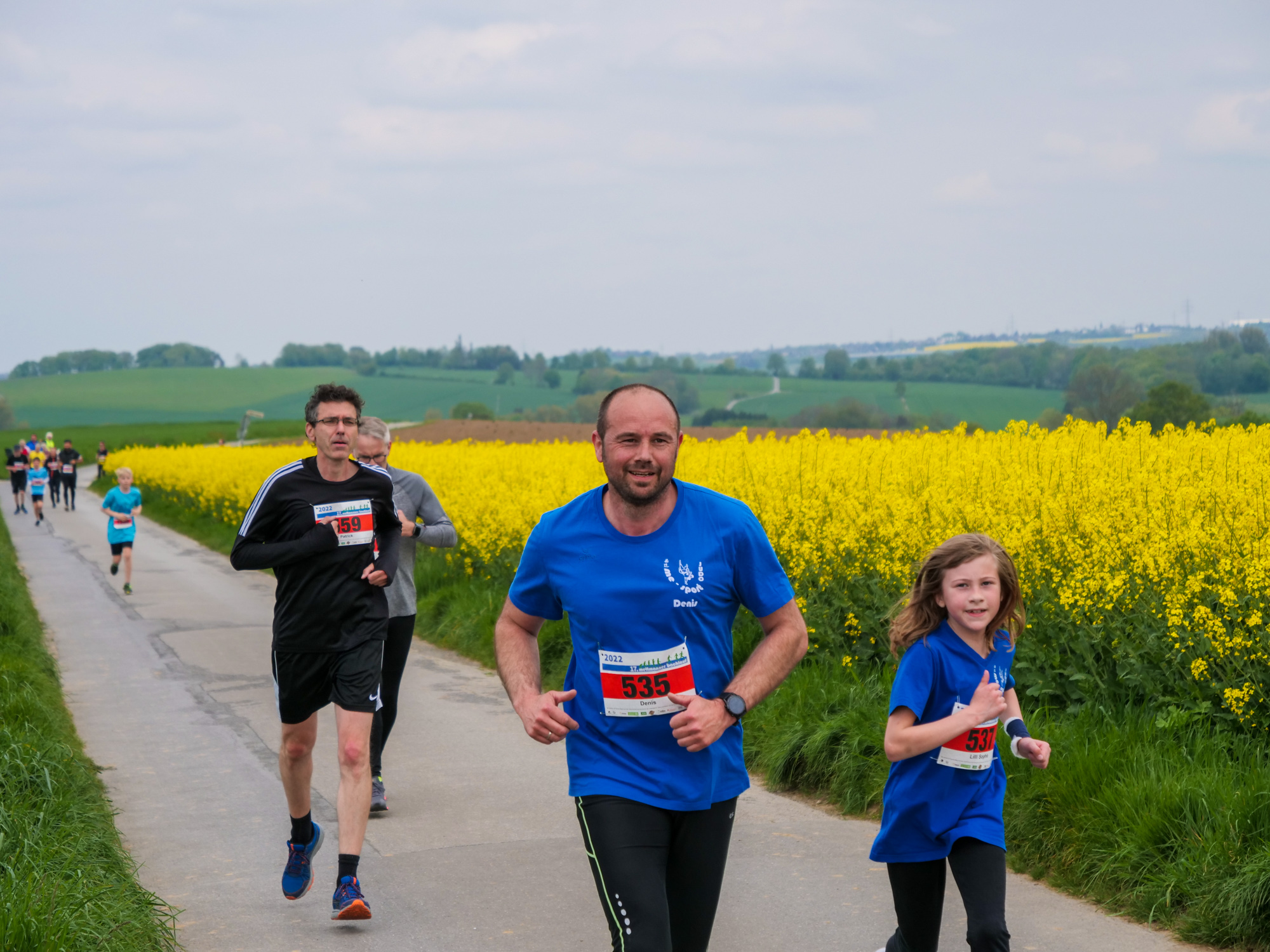 Läufer in blauen T-Shirts joggen auf einem Weg, umgeben von leuchtend gelben Rapsfeldern und grünen Hügeln. Download