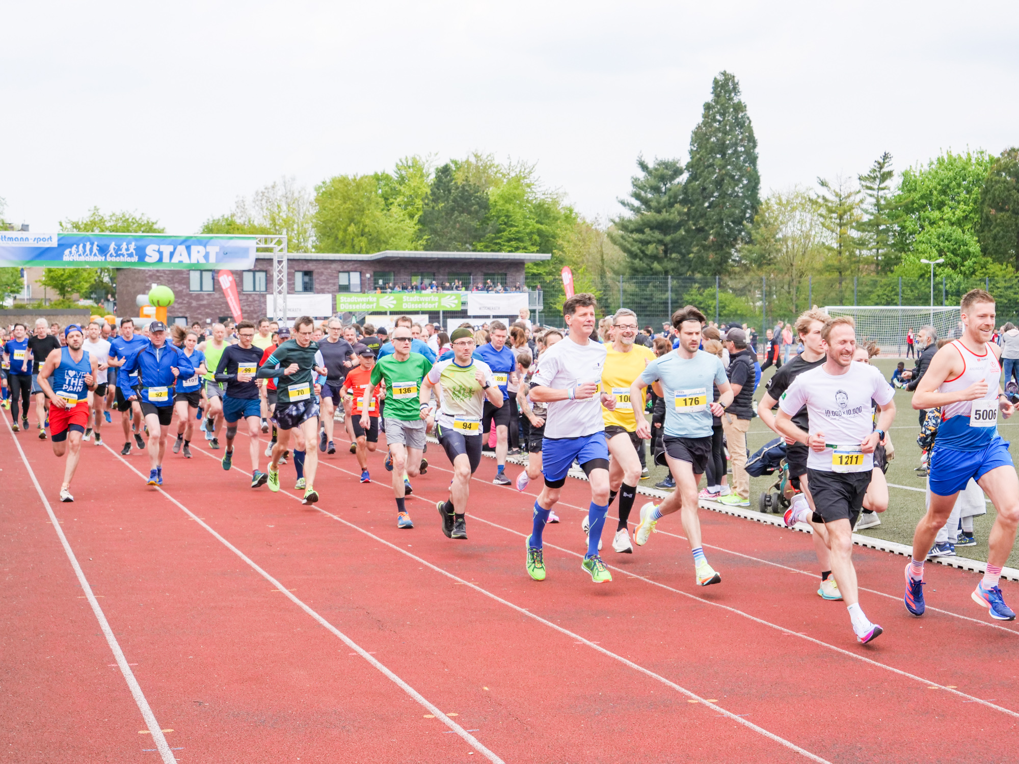 Große Gruppe von Läufern startet gleichzeitig auf einer roten Laufbahn unter einem "START"-Schild. Download