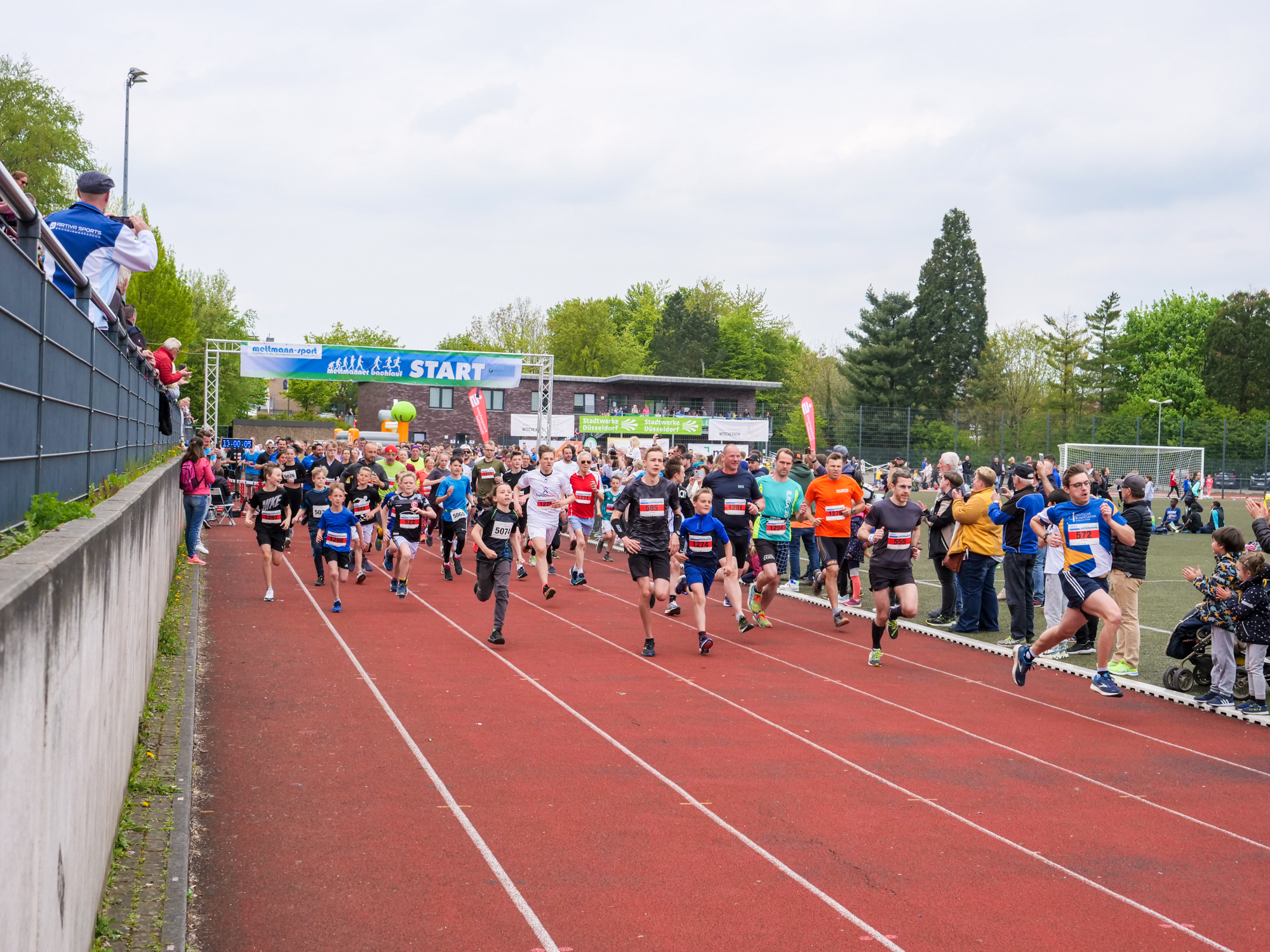 Startschuss für einen Laufwettbewerb mit zahlreichen Läufern auf der Rennbahn und Zuschauern am Rand. Download
