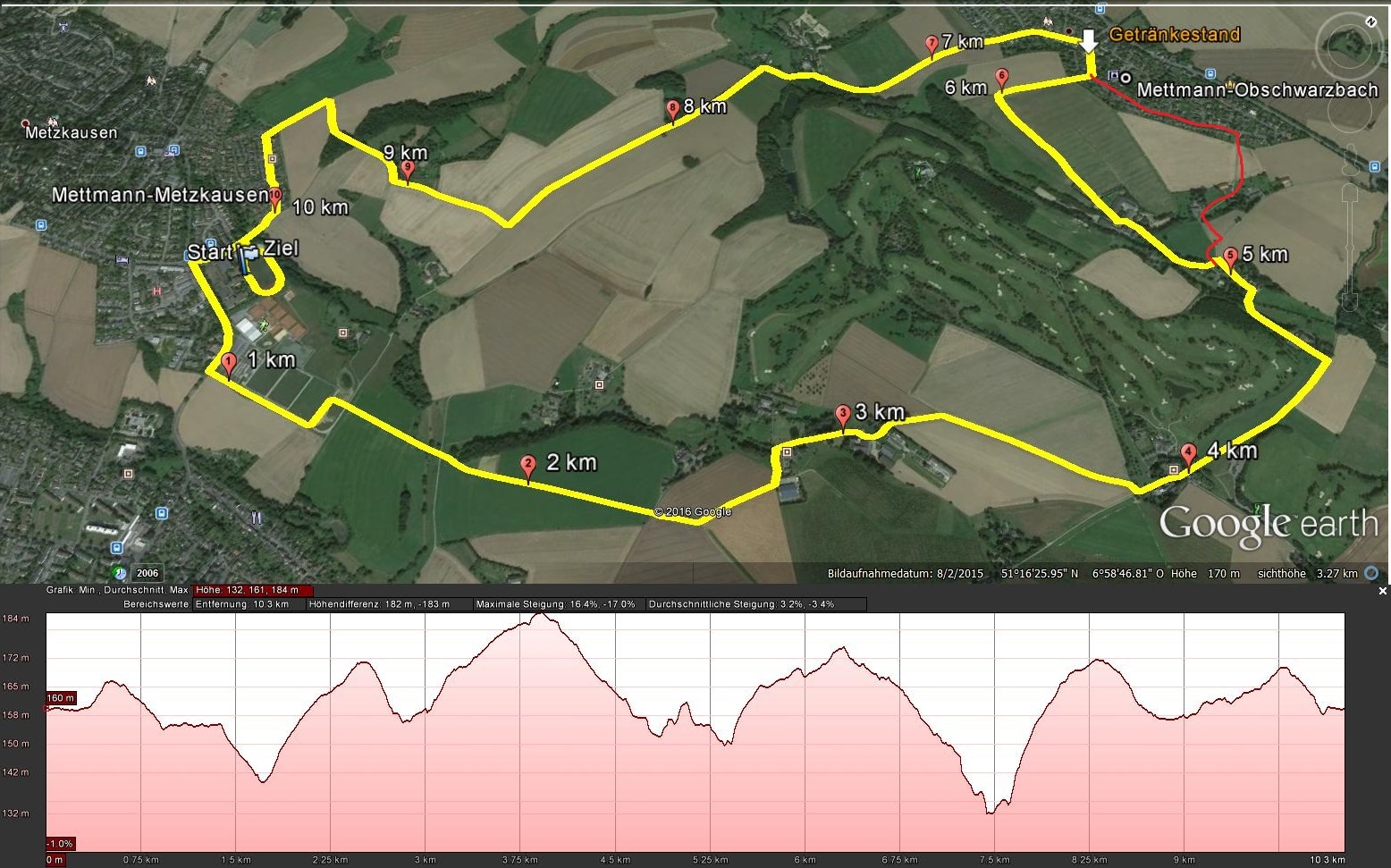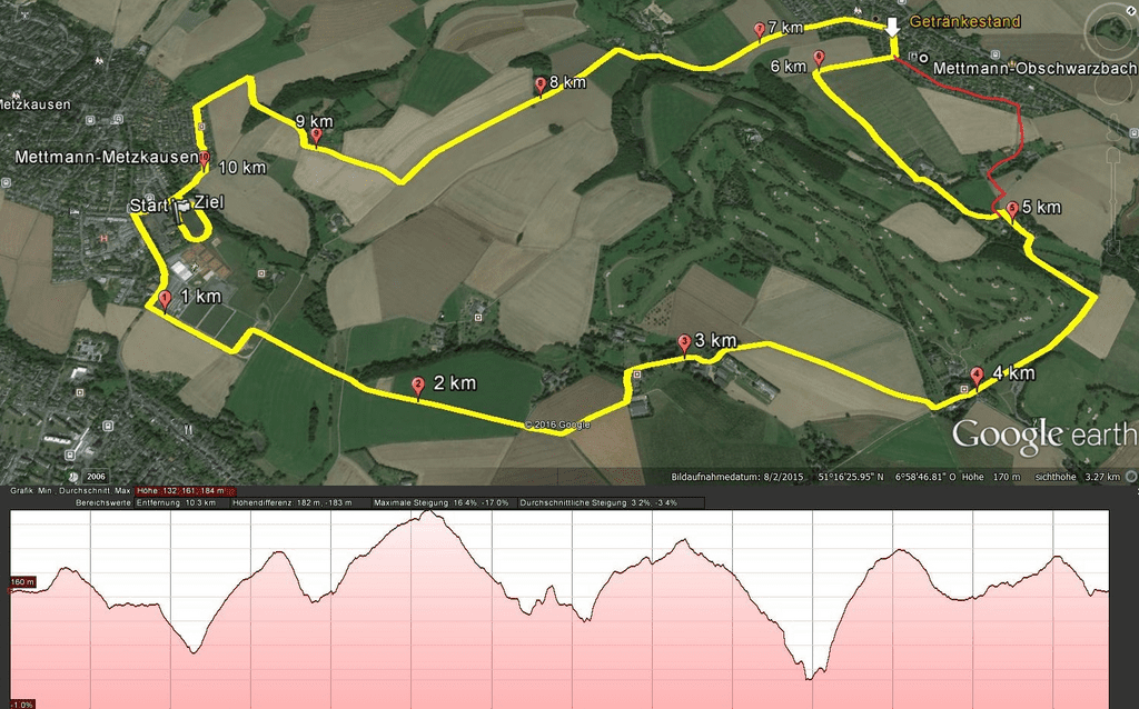 Starte auf der 50m Linie der Tartanbahn auf diese anspruchsvolle Runde und verlasse die Sportanlage nach 300m nach links. Über das schöne Gut Karters, den Golfclub Mettmann und vorbei an der Reitanlage Löckenhoff erreichst Du Obschwarzbach. Hier ist der Bürgerverein Obschwarzbach aktiv und erwartet Dich mit Motivation und Wasser. Weiter gegen den Uhrzeigersinn erreichst Du über den Aktivstall Weidtmann die Meisenburg. Durch das Wohngebiet Löffelbeck wirst Du von Anfeuerungsrufen getragen. Nach 10,3 km geht es auf die Zielgerade zurück ins Stadion. Die 10km Strecke ist GELB/ROT markiert.