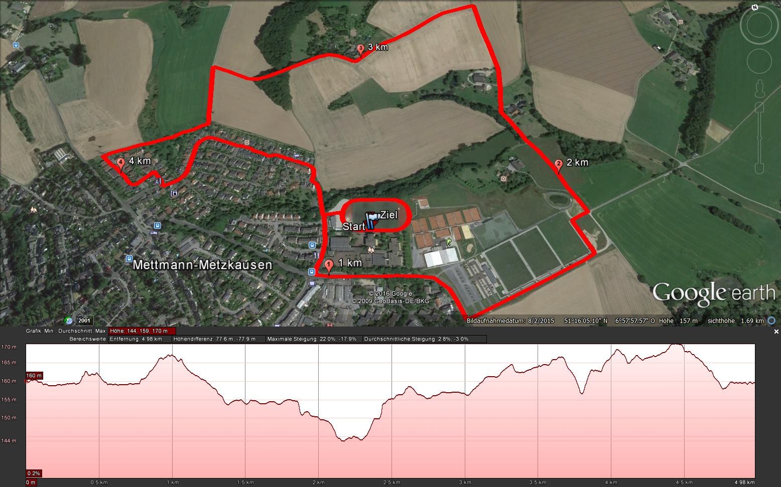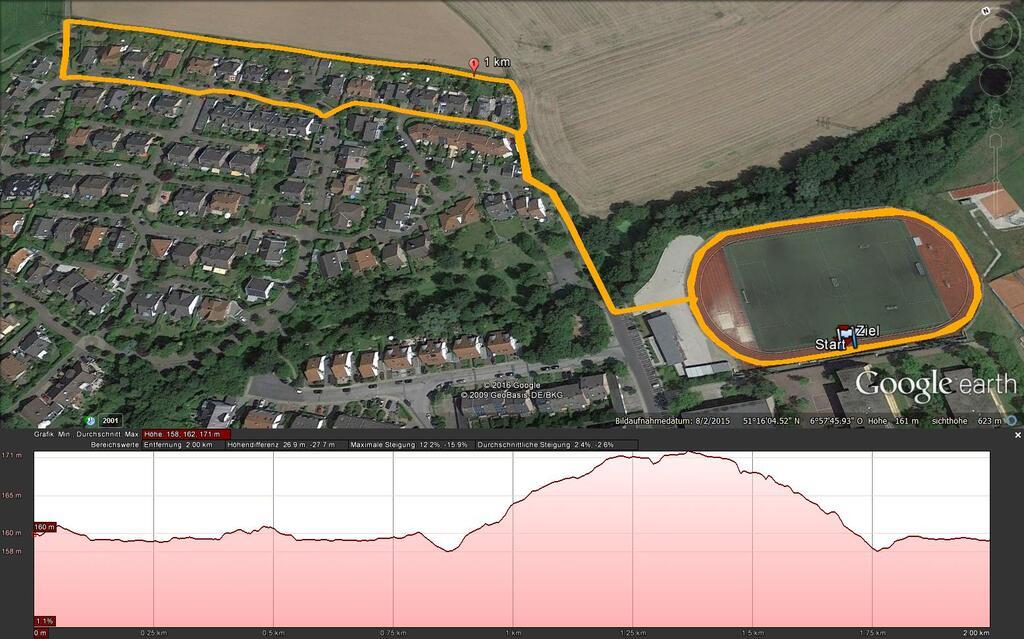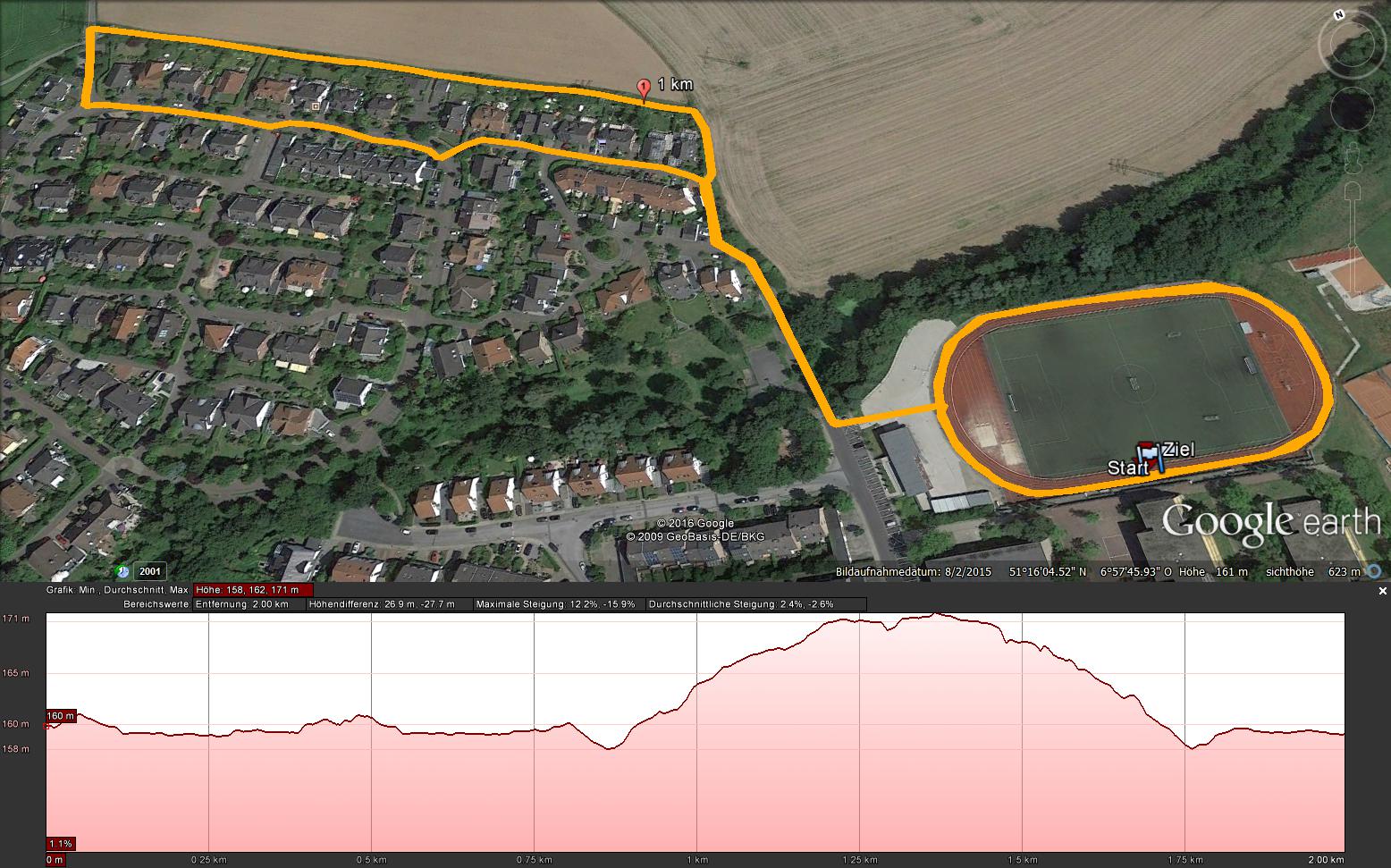 Start und Ziel befinden sich auf der Laufbahn der Sportanlage am Heinrich-Heine-Gymnasium, Hasselbeckstr.6, Mettmann.