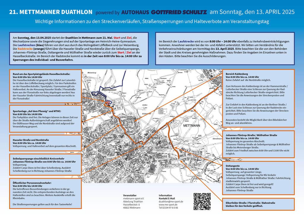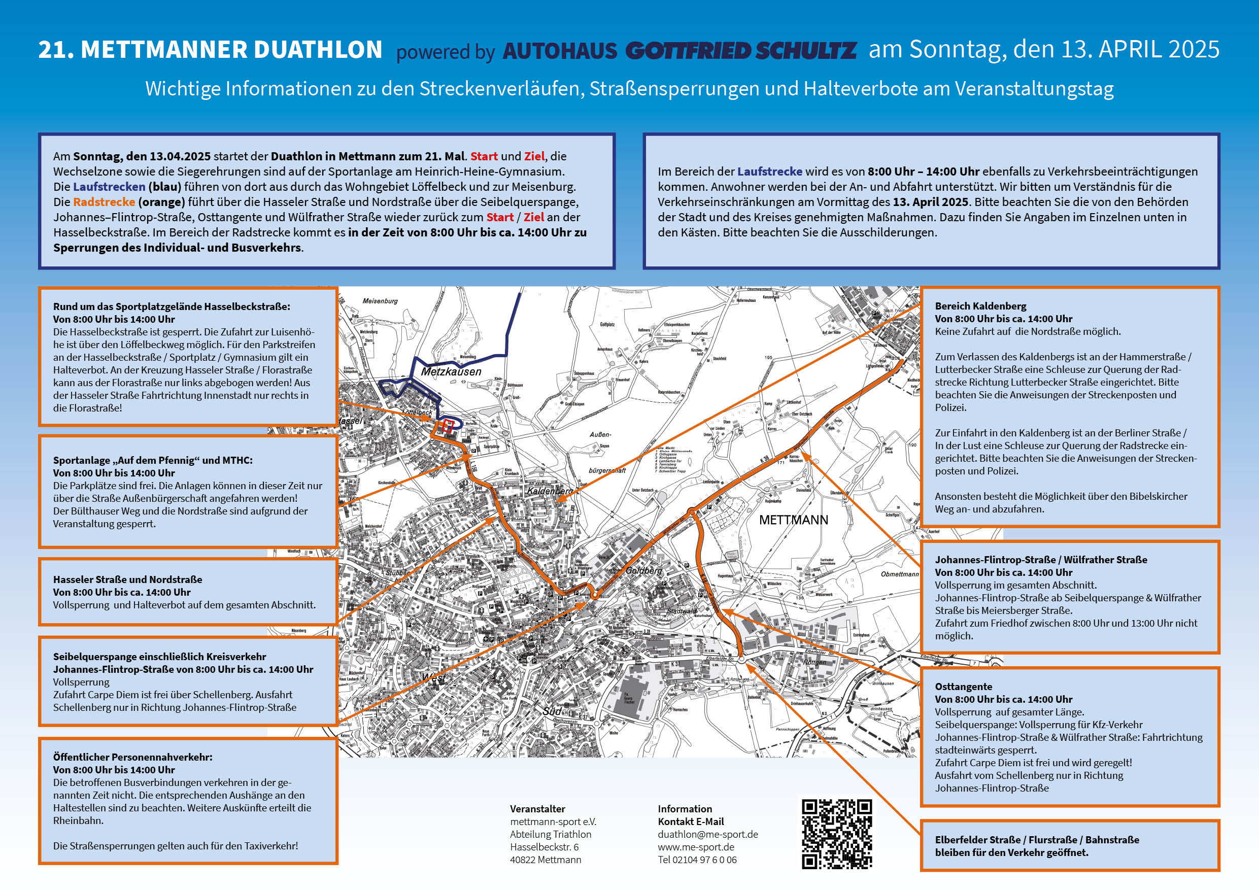 Im Bereich der Laufstrecke wird es von 8:00 – 14:00 Uhr zu Verkehrsbeeinträchtigungen kommen. Anwohner werden bei der An- und Abfahrt unterstützt. Wir bitten um Verständnis für die Verkehrseinschränkungen am Vormittag des 13. April 2025. Bitte beachten Sie die von den Behörden der Stadt und des Kreises genehmigten Maßnahmen. Bitte beachten Sie die Ausschilderungen.