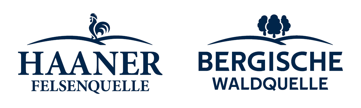 Zwei Logos: links "HAANER FELSENQUELLE" mit Hahn, rechts "BERGISCHE WALDQUELLE" mit drei Bäumen auf Hügeln.