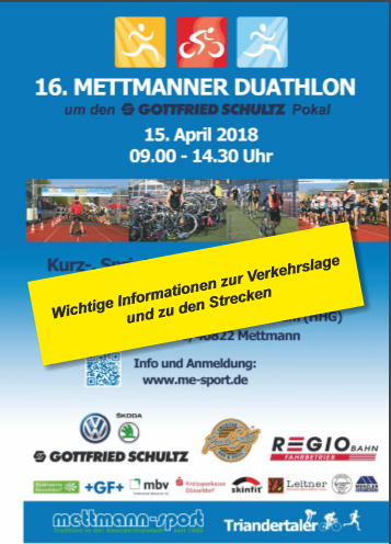 Knapp vier Wochen vor dem 16. Mettmanner Duathlon informierten die Veranstalter im Beisein des Bürgermeisters Thomas Dinkelmann die anwesenden Pressevertreter über alles Wichtige rund um den diesjährigen Mettmanner Duathlon. Neben der erfreulichen Entwicklung bei den Teilnehmerzahlen standen dabei die Absicherung der Strecken und die Auswirkungen auf den Verkehr in Mettmann und Umgebung im Fokus. Die Veranstalter konnten mit 360 Einzelstartern und 36 Staffeln schon jetzt über einen gegenüber dem Vorjahr erneut erhöhtem Meldestand berichten. Bei der Radstrecke wurde eine Änderung bekannt gegeben, die zu einem flüssigeren Ablauf der Verkehrsflüsse rund um die Veranstaltung beitragen soll. Trotzdem werden sich durch die für die Sicherheit der Sportler nötigen Sperrmaßnahmen in der Innenstadt Beeinträchtigungen des Individualverkehrs nicht vermeiden lassen. Details hierzu können den Informationen für Anwohner auf der Homepage zur Veranstaltung entnommen werden. Zuschauer können sich im Bereich um den Jubiläumsplatz, an den Steilstrecken im Bereich der Stindermühle in Erkrath sowie rund um das Start-/Zielgelände am Heinrich-Heine Gymnasium ein Bild von der attraktiven Ausdauersportart Duathlon machen.