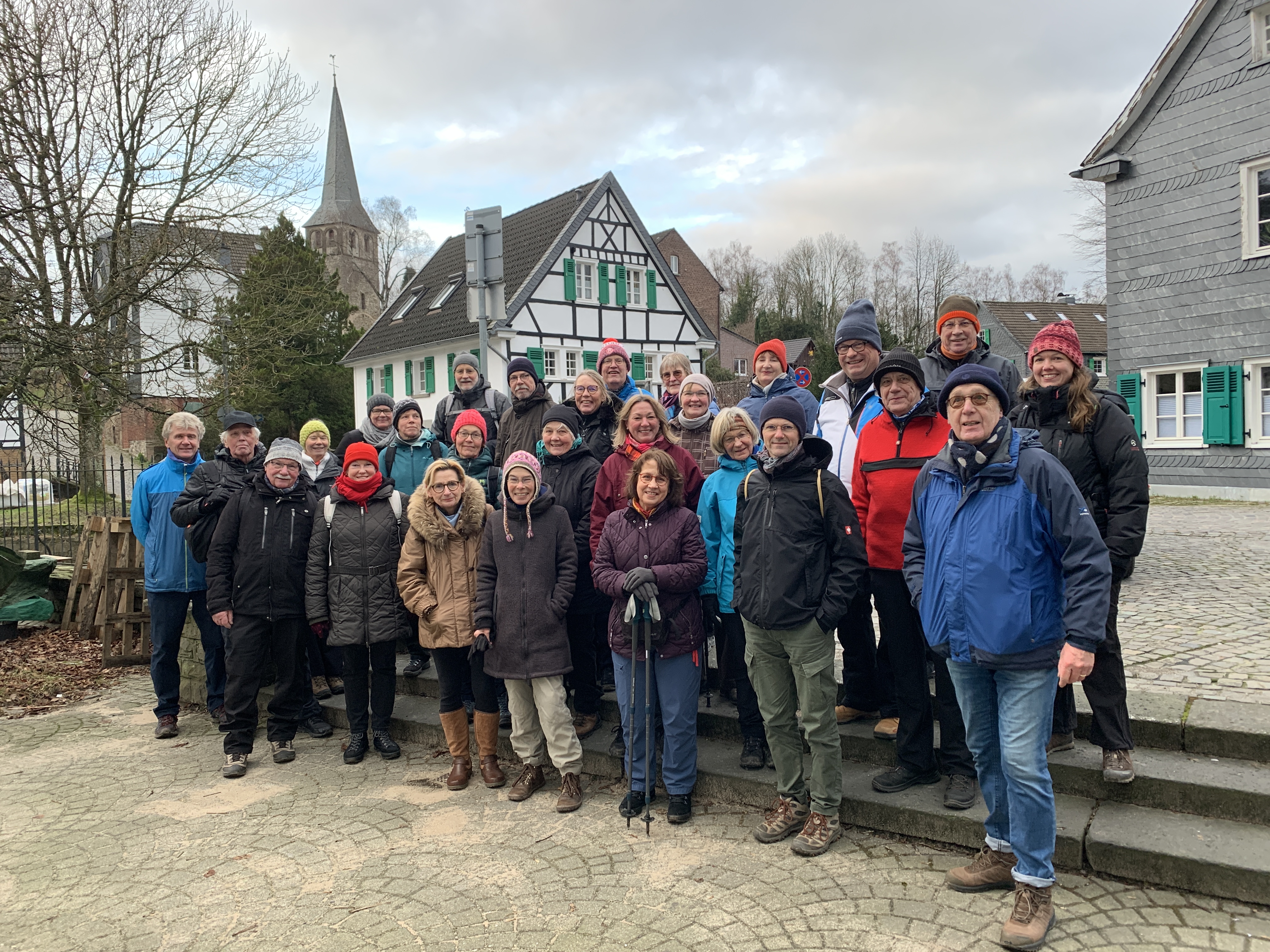 Gruppe von 30 Personen in warmen Winterkleidern steht auf einer Treppe vor Fachwerkhäusern und einem Kirchturm.