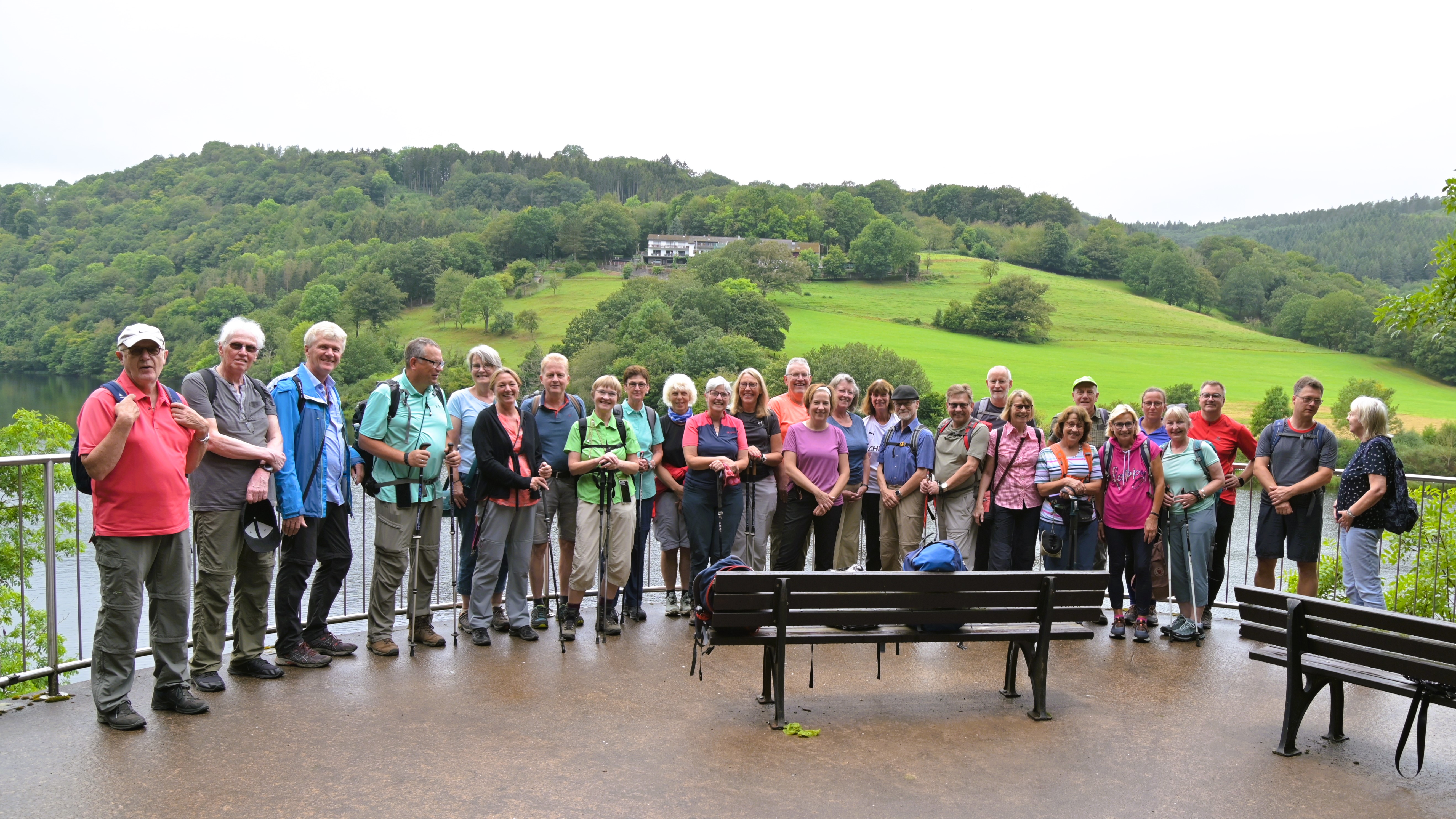 Gruppe von Wanderern steht auf Aussichtsplattform mit Blick auf einen See und grüne Hügel. Sitzbank im Vordergrund.