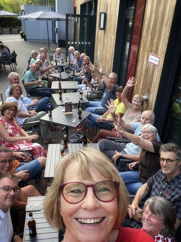 Gruppenaufnahme von Menschen an einem Tisch im Freien, alle lächeln und winken, mit Getränken auf dem Tisch.