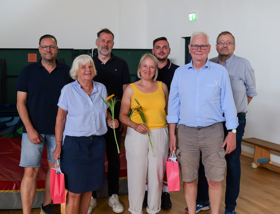 Gruppe von sieben Personen in einer Sporthalle, einige halten Blumen und Geschenke, beide Geschlechter vertreten.