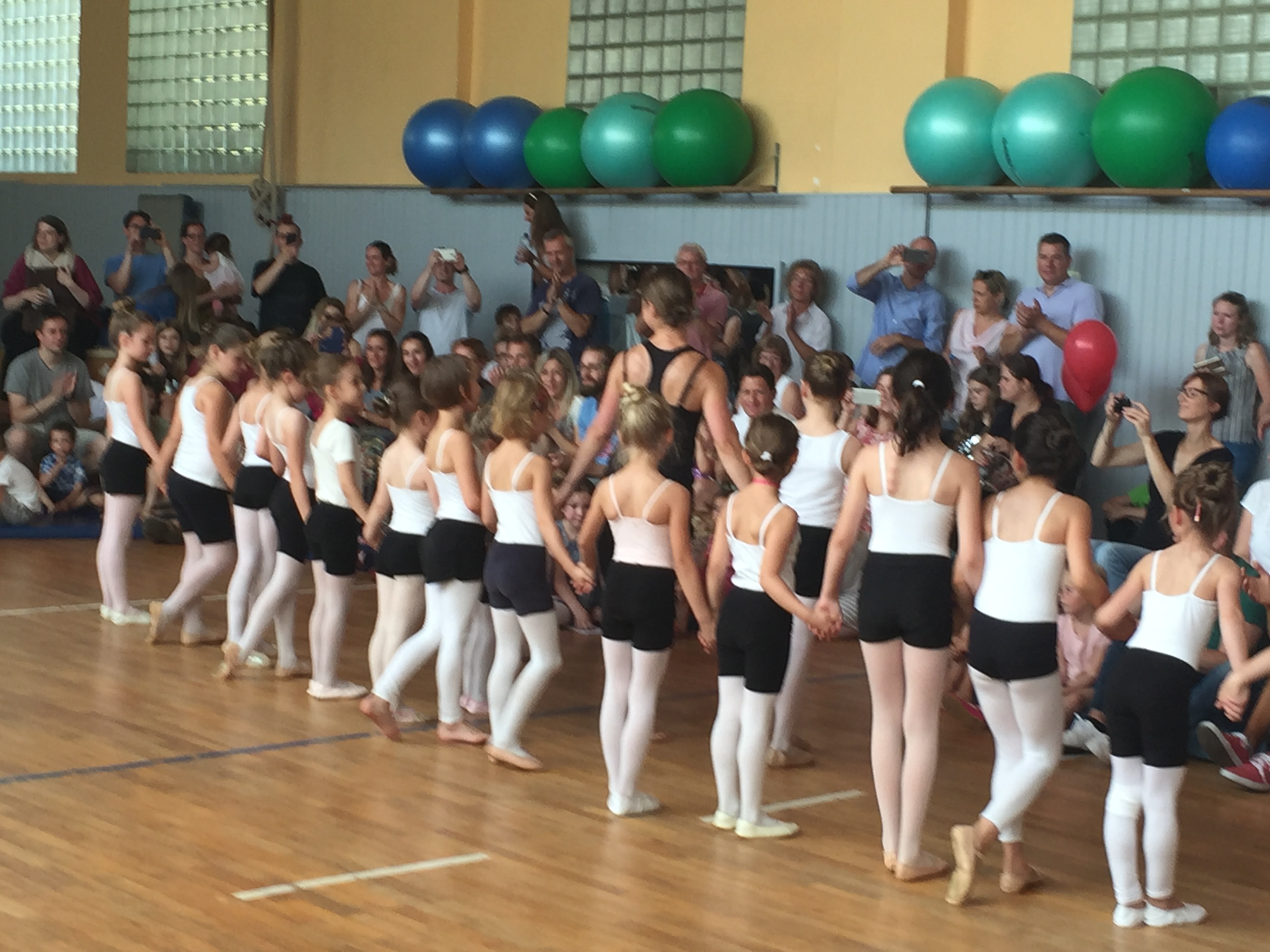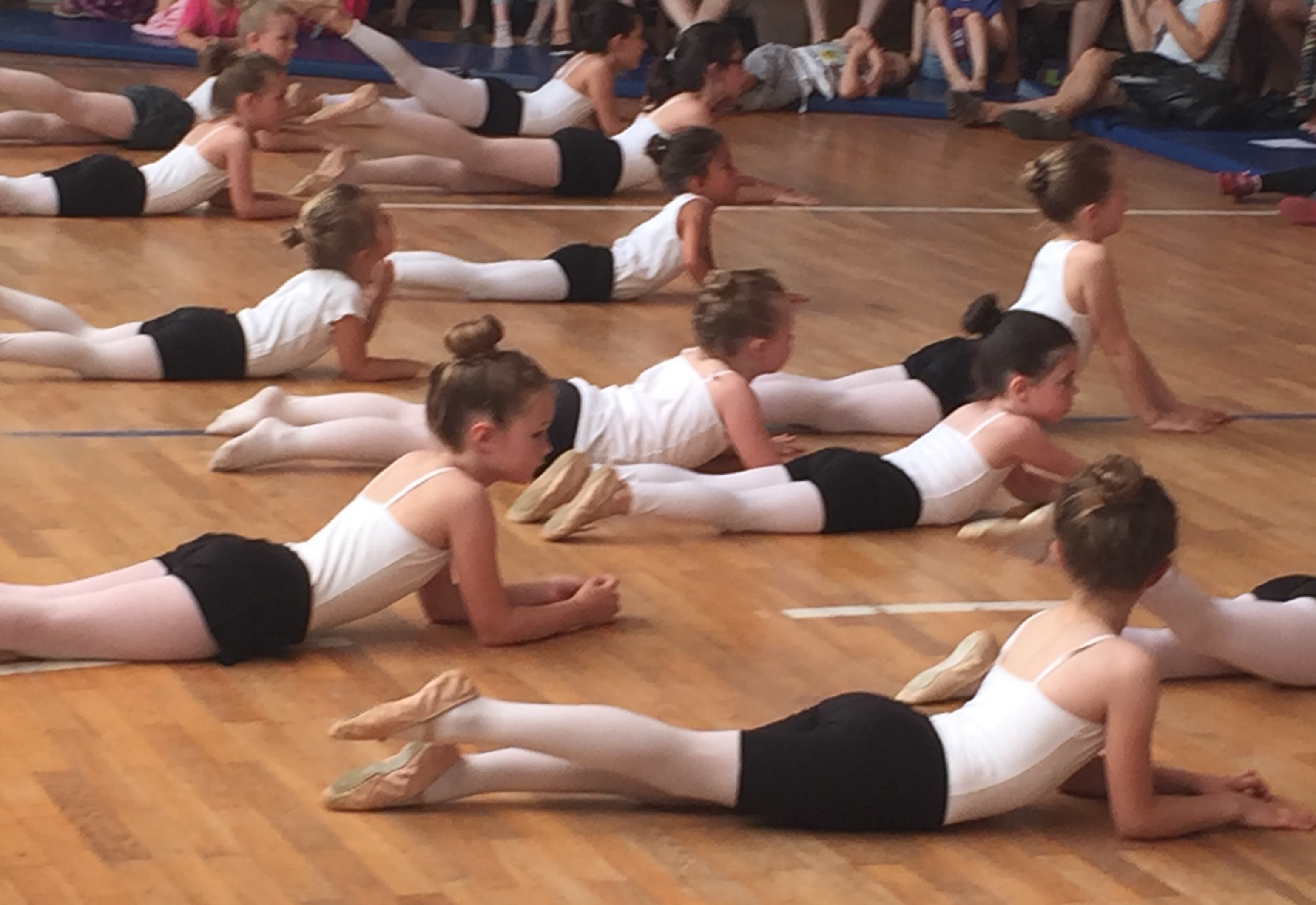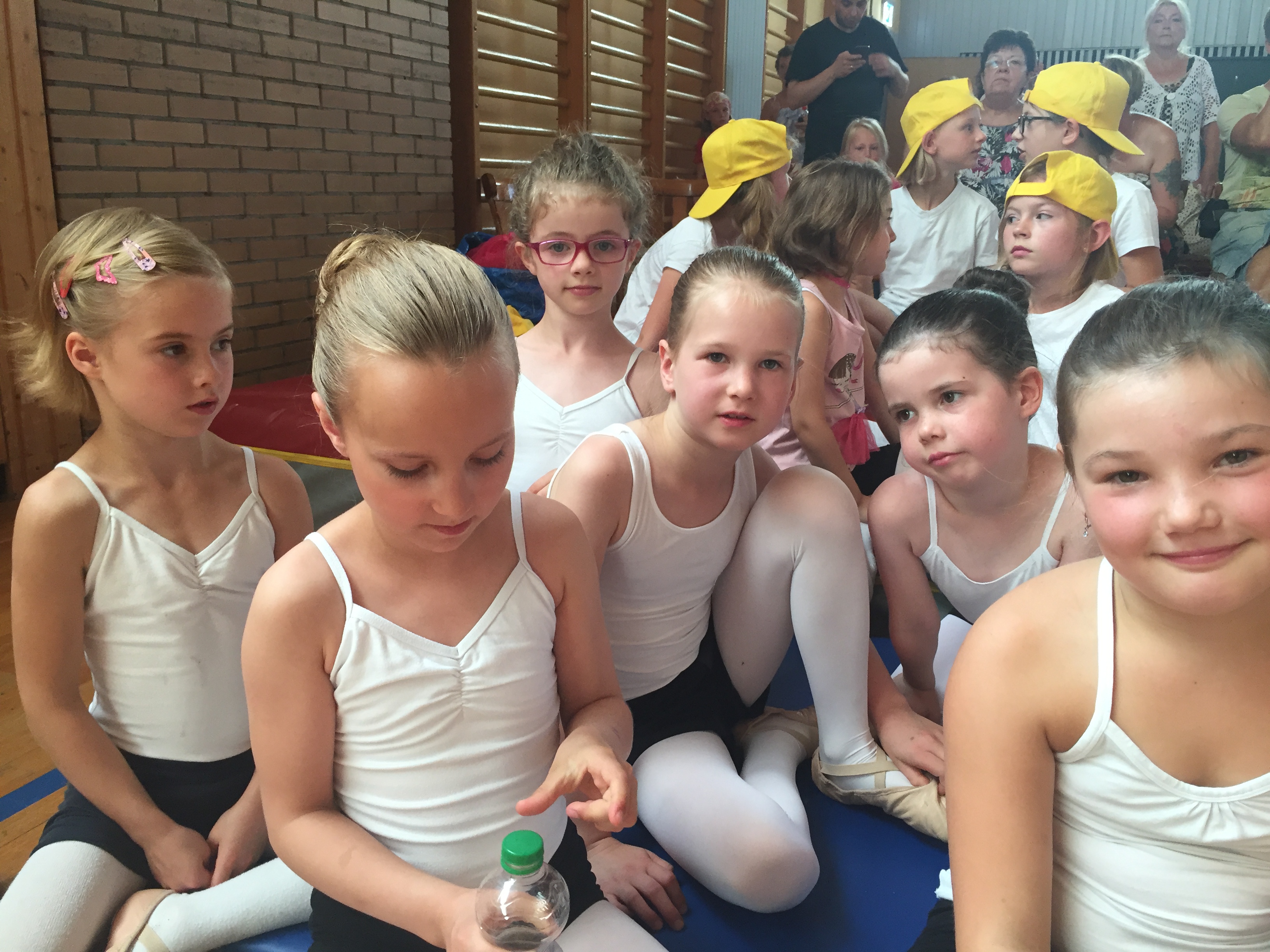 Gruppenvorstellung von Mädchen in Ballettkleidung, die auf einer Bühne vor einem Publikum zusammenstehen.