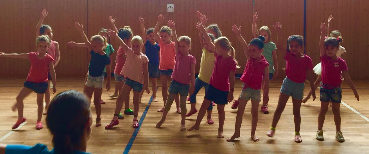 Gruppe von Mädchen in bunten T-Shirts und Shorts, die im Tanzstudio synchron tanzen und dabei die Arme heben.