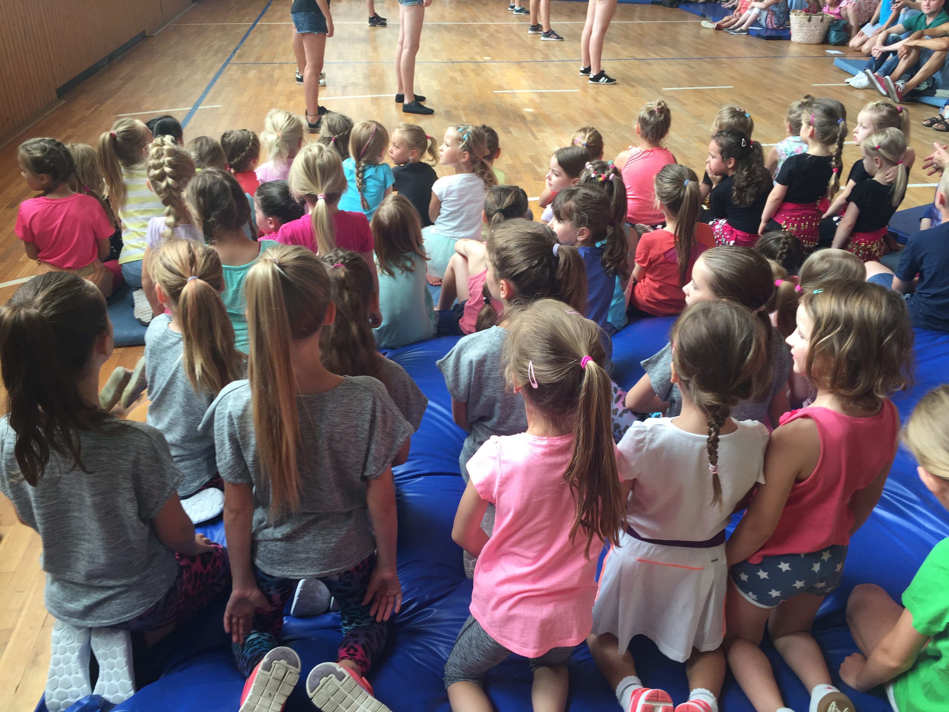 Mädchen in bunten Shirts sitzen auf einer blauen Matte und schauen einem Auftritt in einer Sporthalle zu.