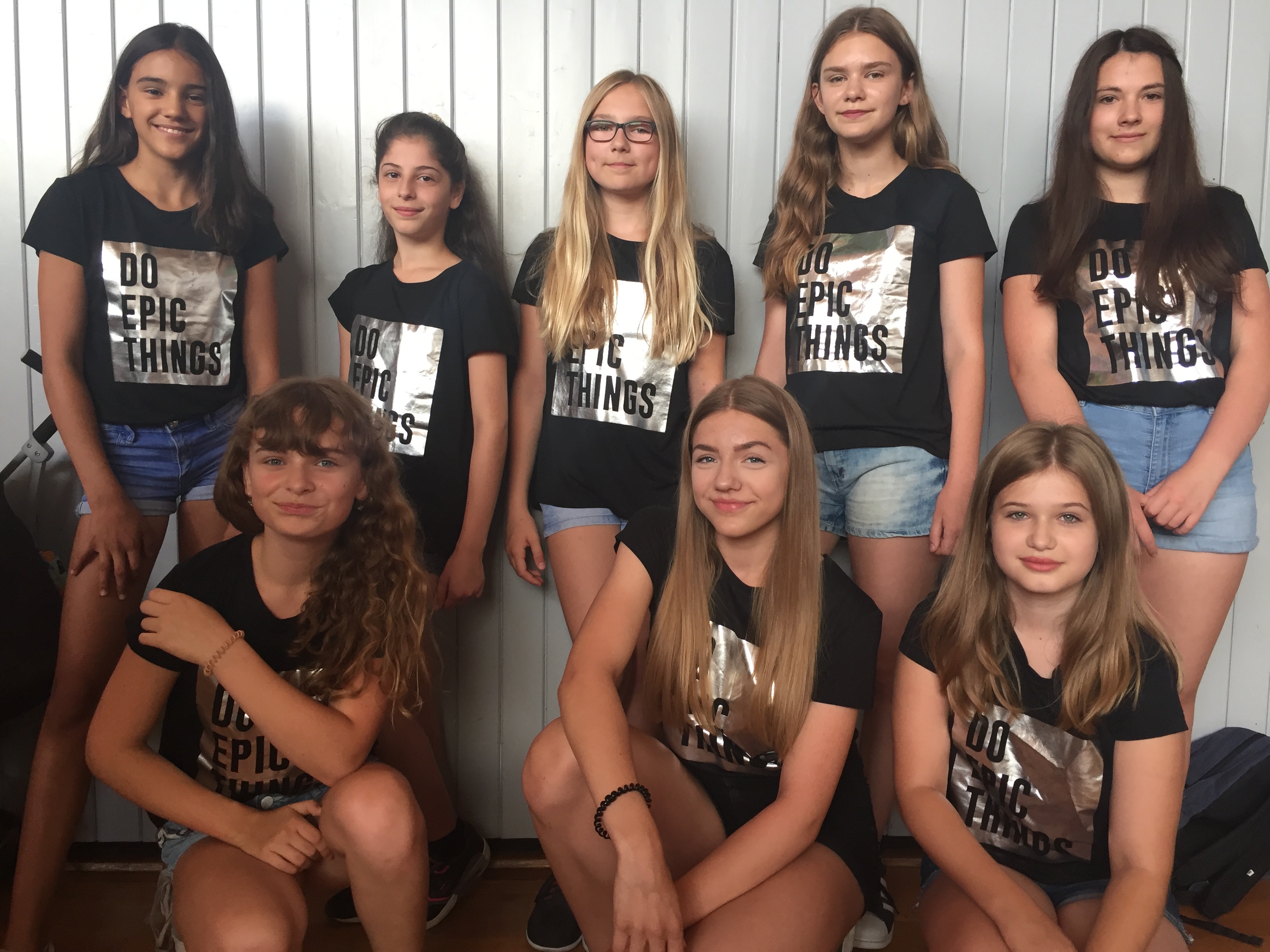 Gruppenfoto von acht Mädchen in schwarzen T-Shirts mit dem Aufdruck "DO EPIC THINGS", lächelnd vor einer hellen Wand.