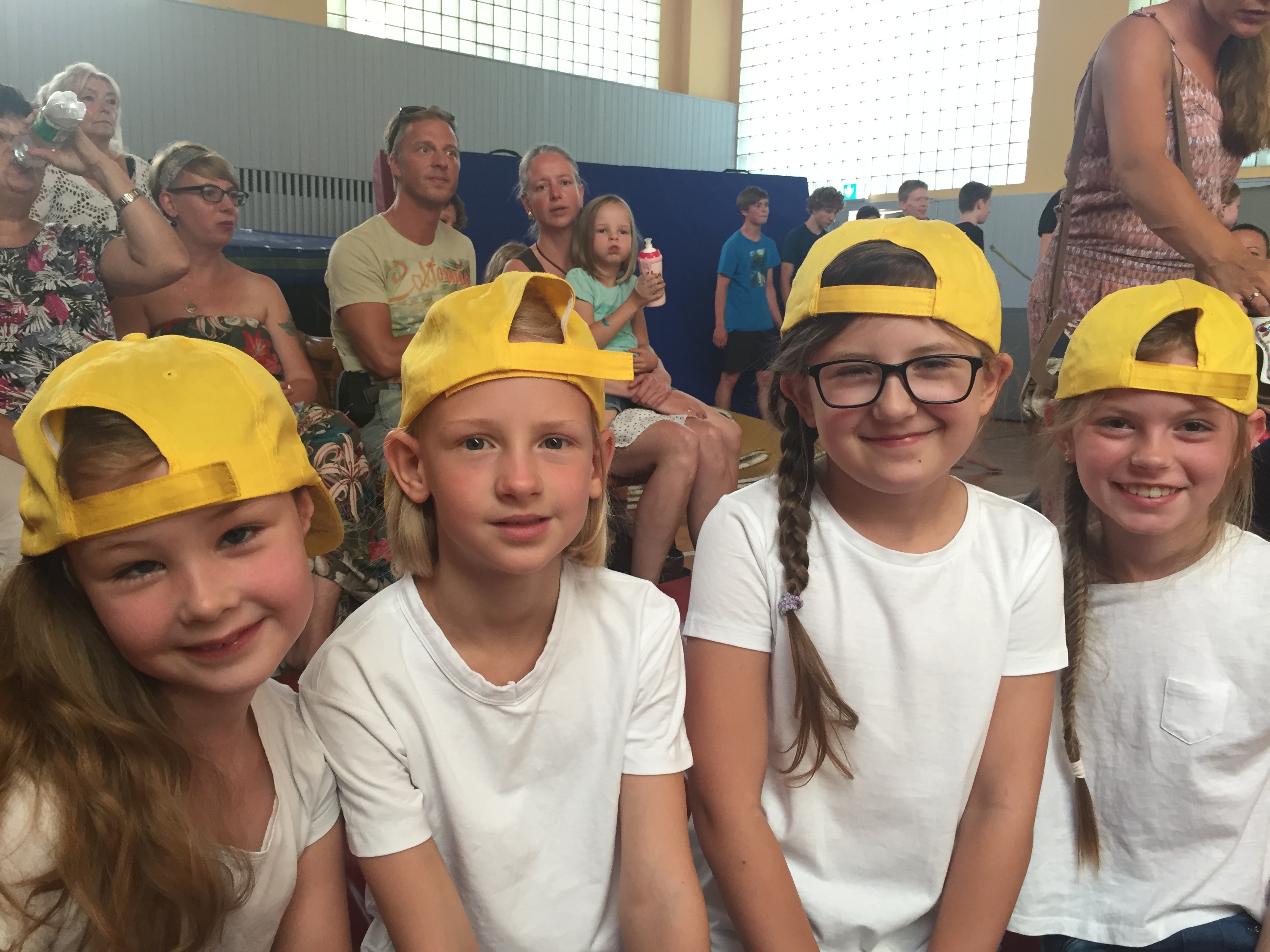 Vier Kinder mit gelben Caps lächeln in weißen T-Shirts, während Erwachsene im Hintergrund zuschauen.
