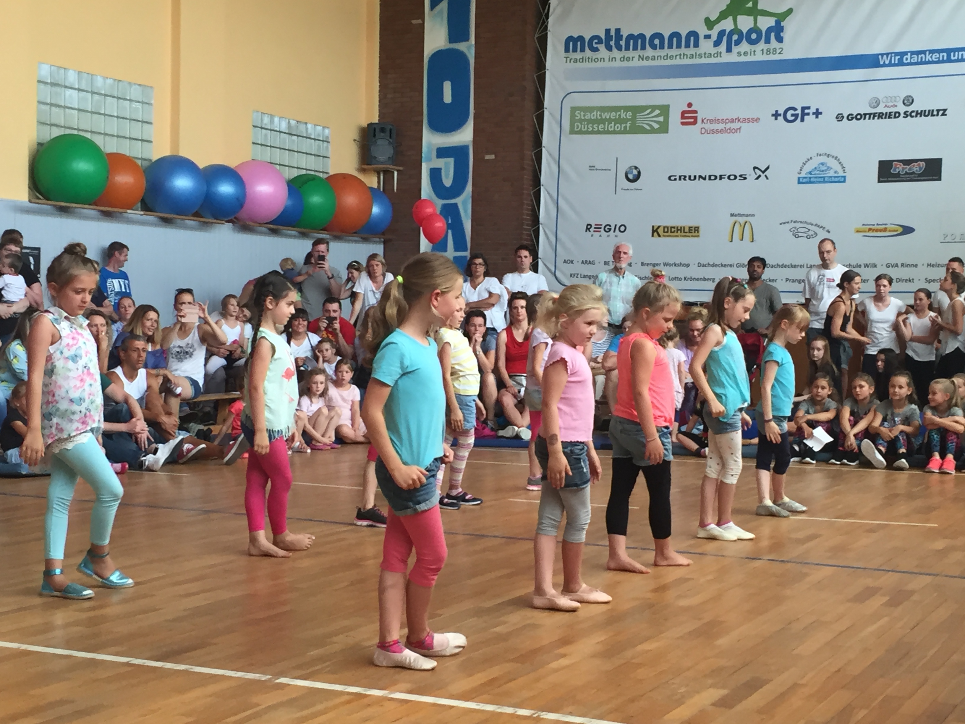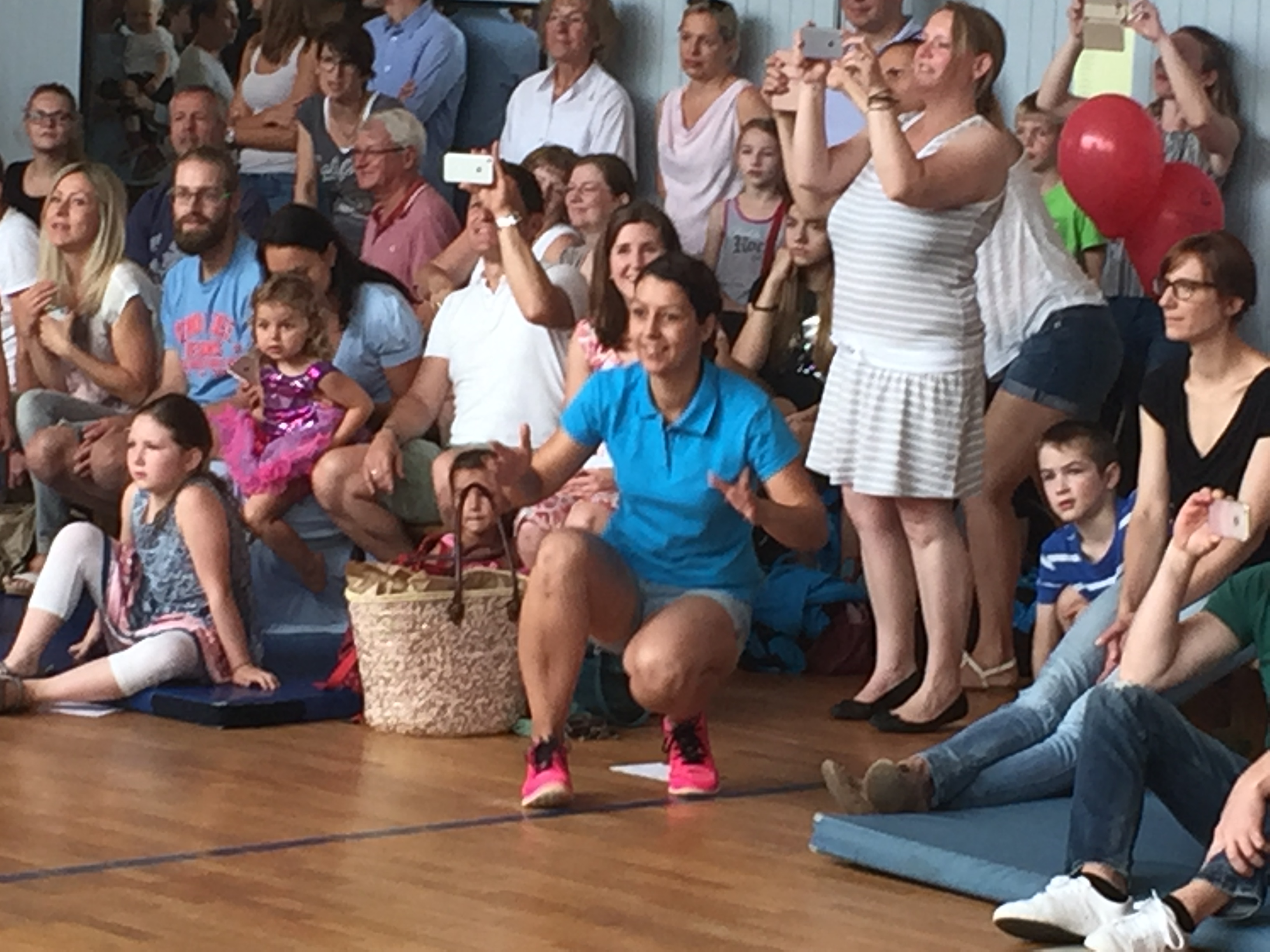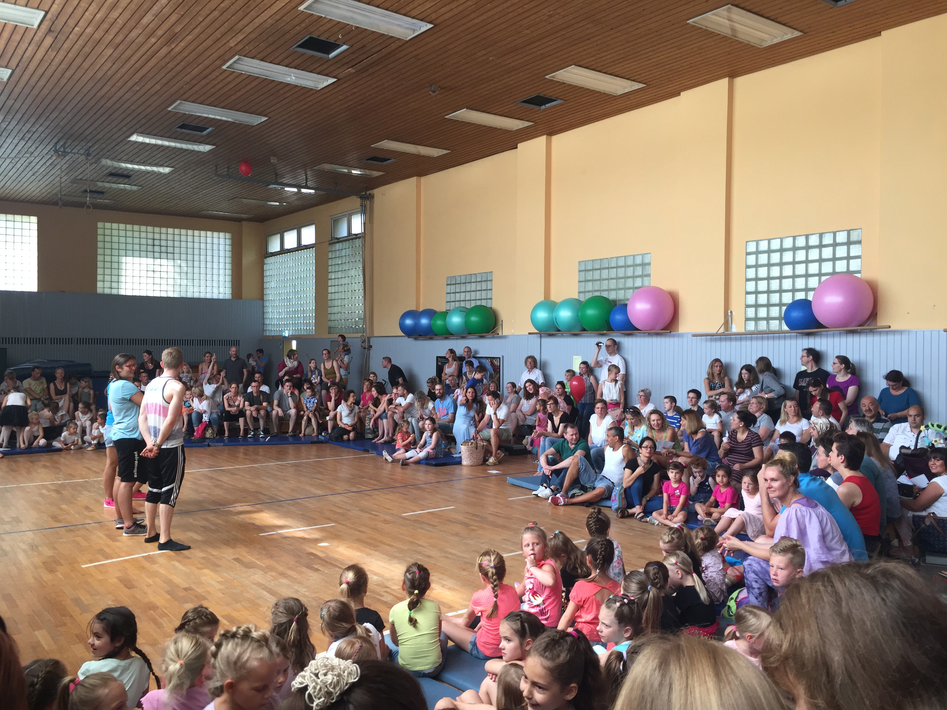 Vielzahl von Zuschauern in einem Sportbereich, während zwei Personen eine Vorführung durchführen. Bunte Gymnastikbälle im Hintergrund.