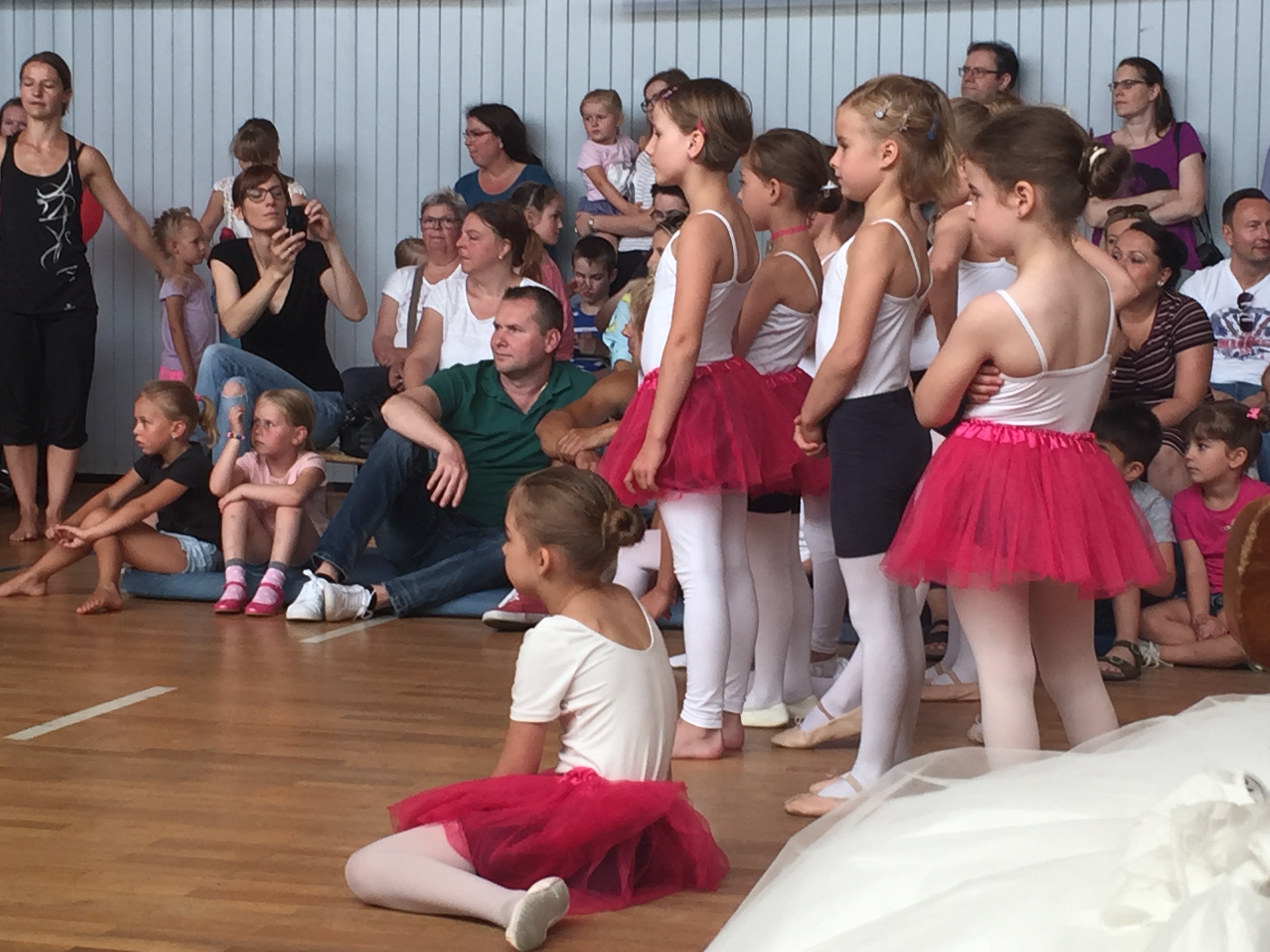 Gruppe junger Tänzerinnen in Ballettanzug und Tüllröcken bei einer Aufführung, umgeben von Zuschauern.
