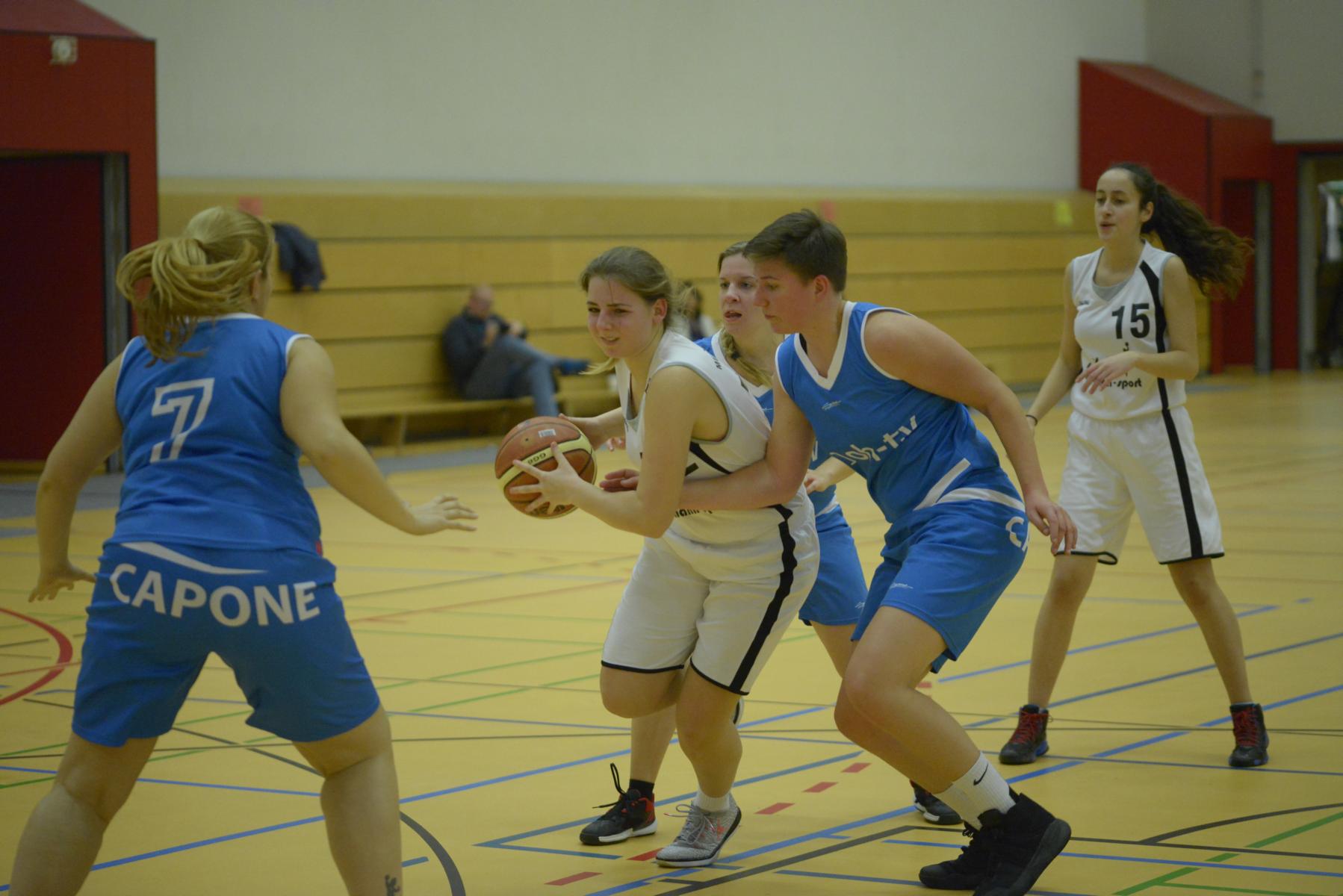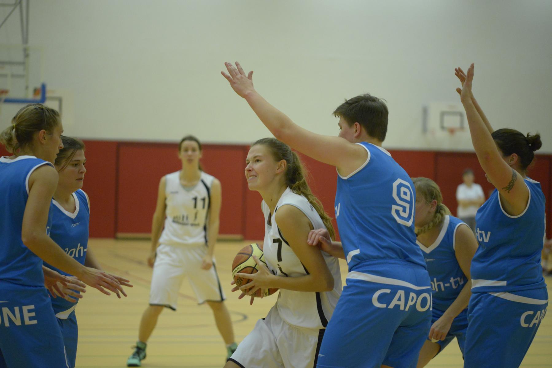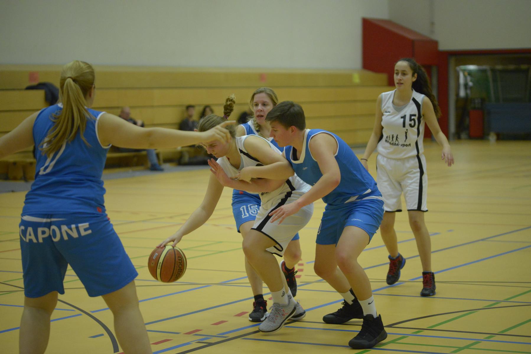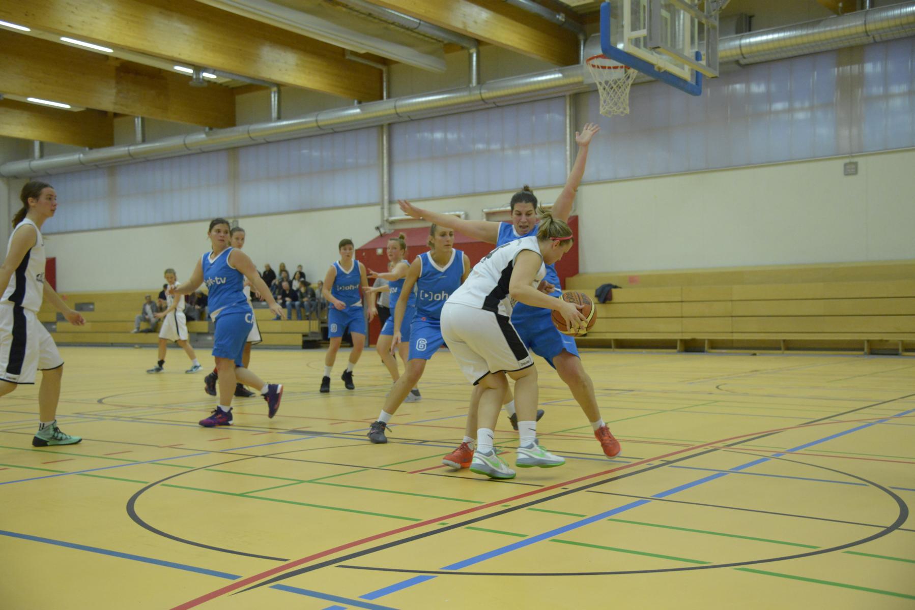 Spielszene in einer Basketballhalle: Spielerinnen in blauen und weißen Trikots kämpfen um den Ball auf dem Spielfeld.