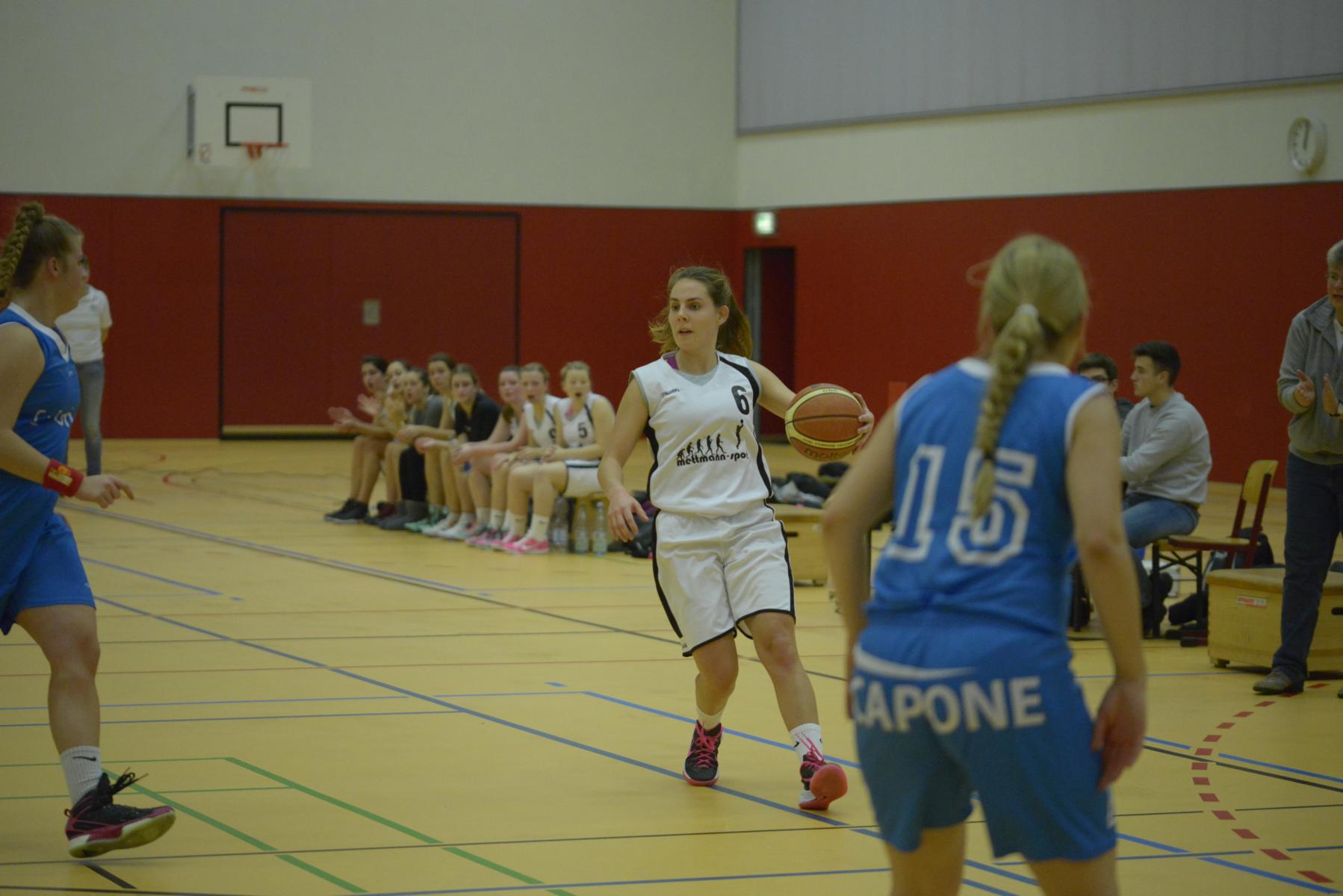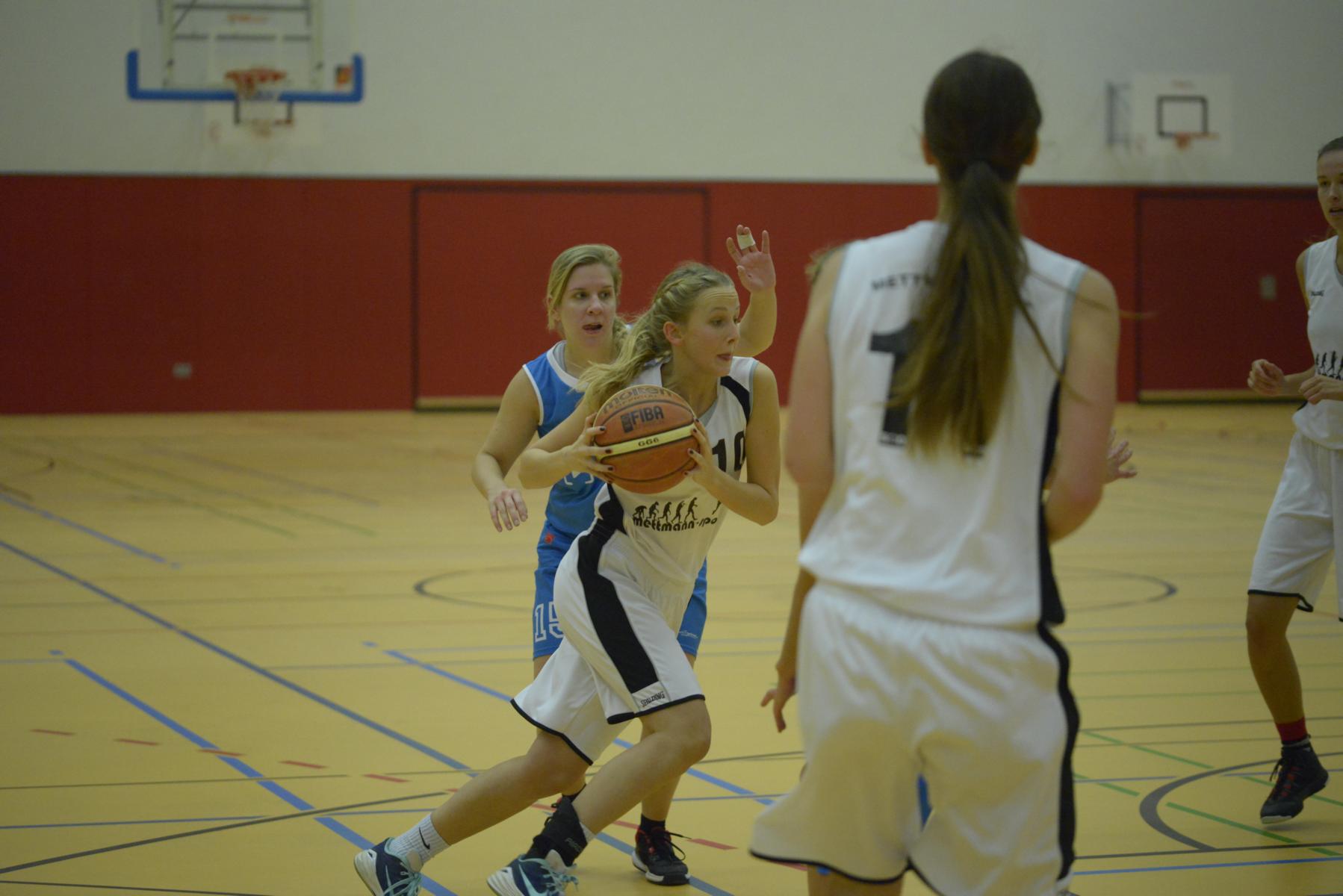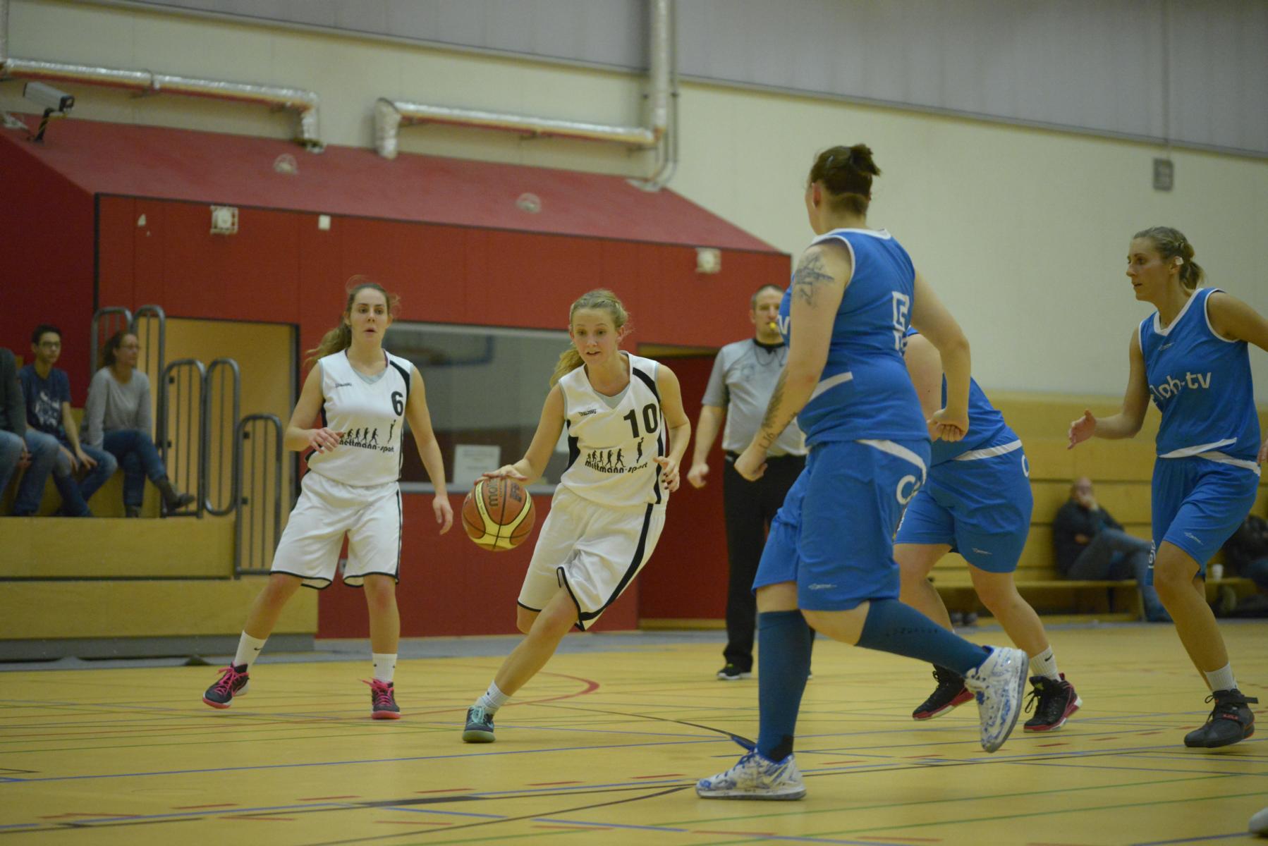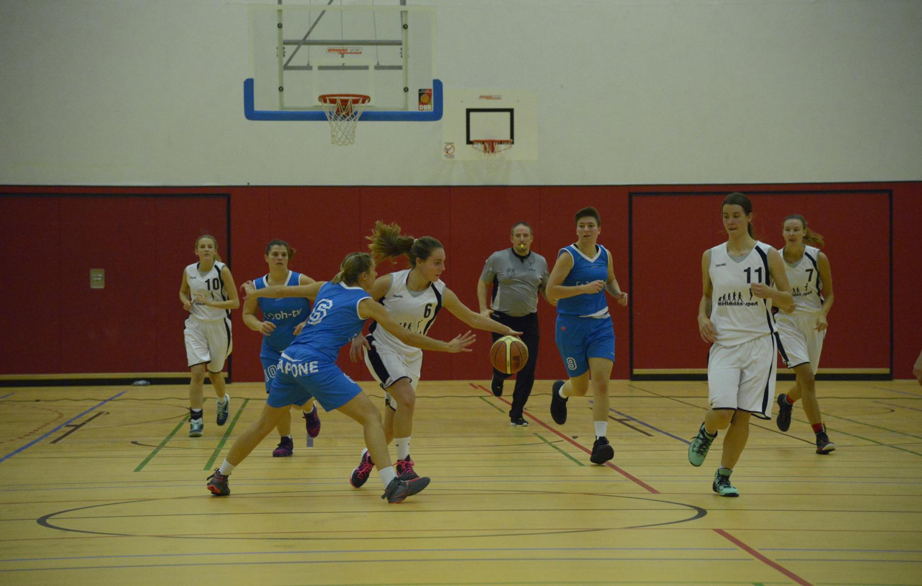 Spielszene in einer Basketballhalle: Spielerinnen in blauen und weißen Trikots kämpfen um den Ball auf dem Spielfeld.