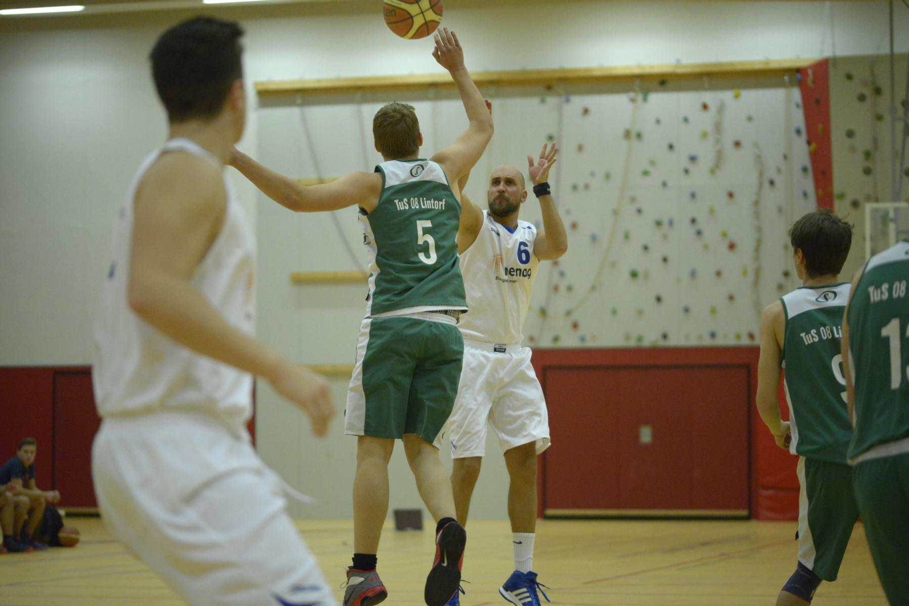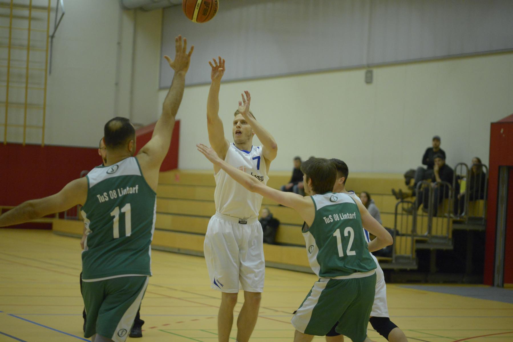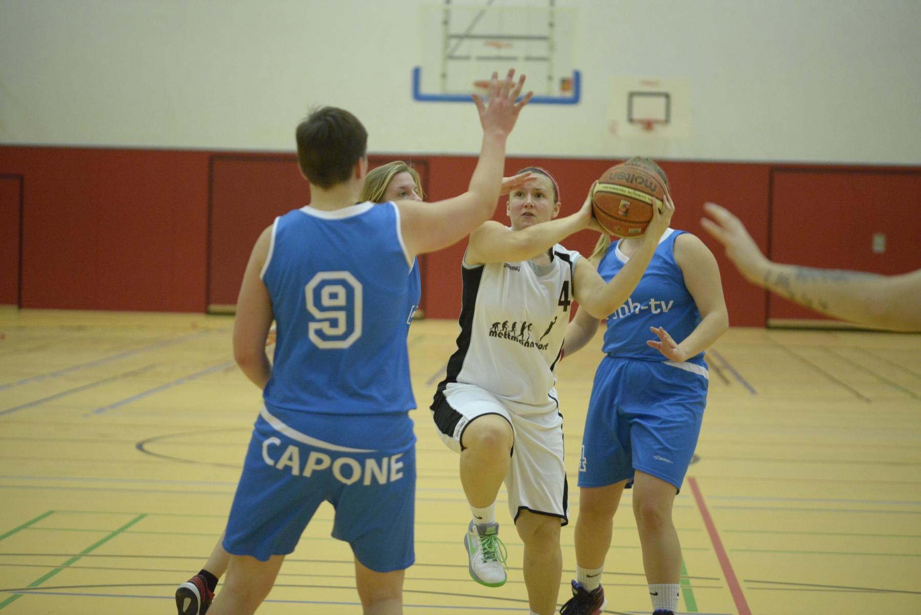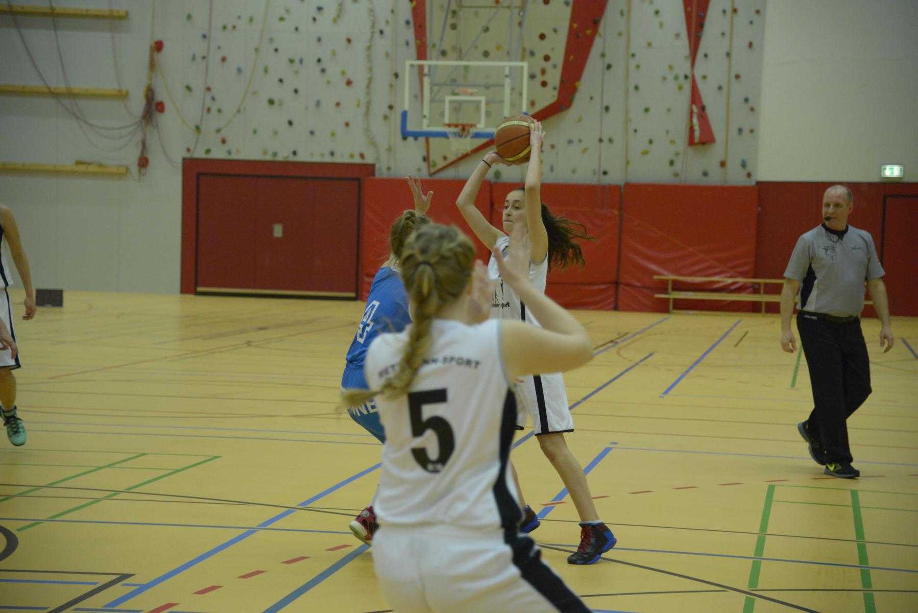 Basketballspiel: Eine Spielerin wirft den Ball, während zwei Gegnerinnen versuchen, ihn zu blockieren.