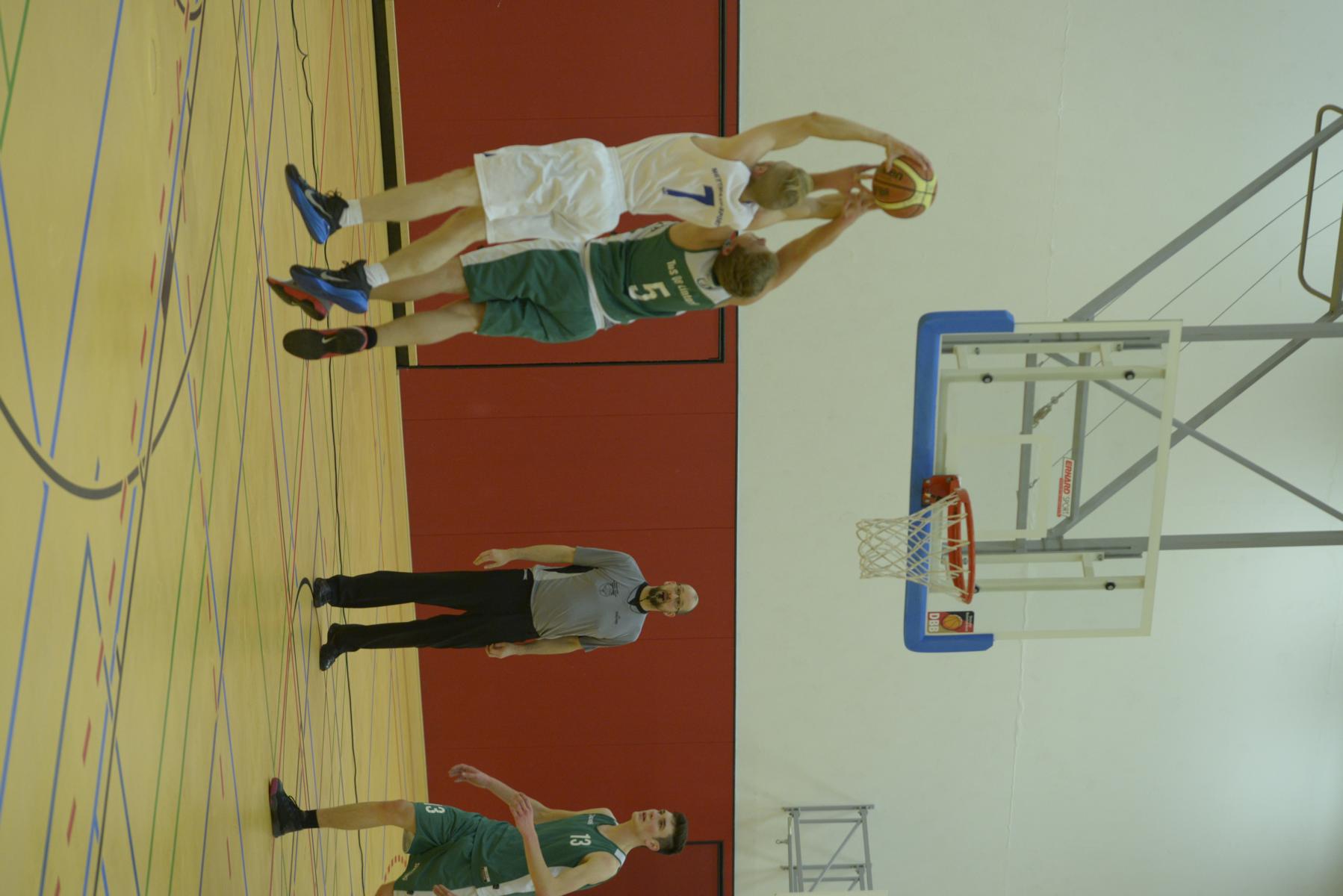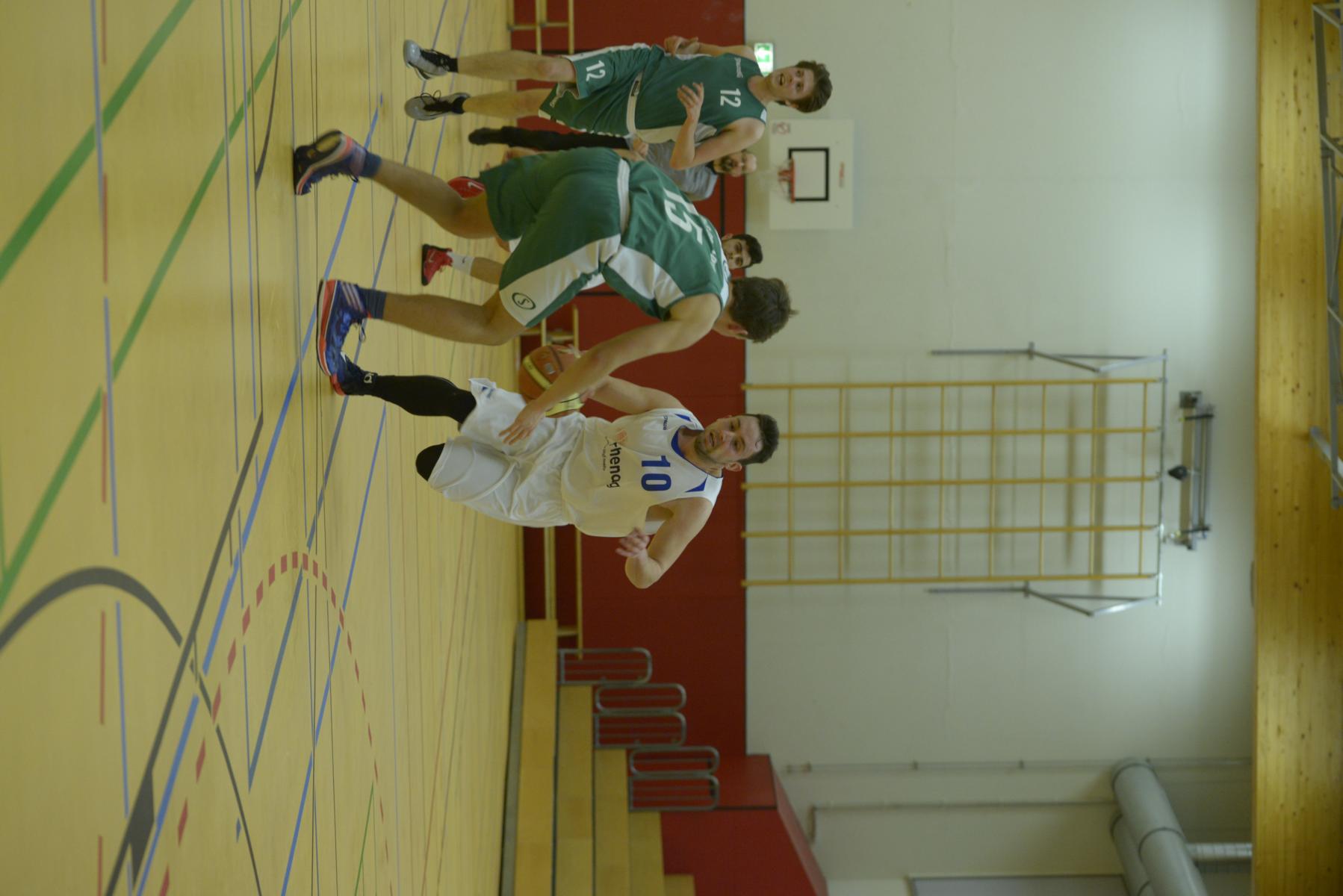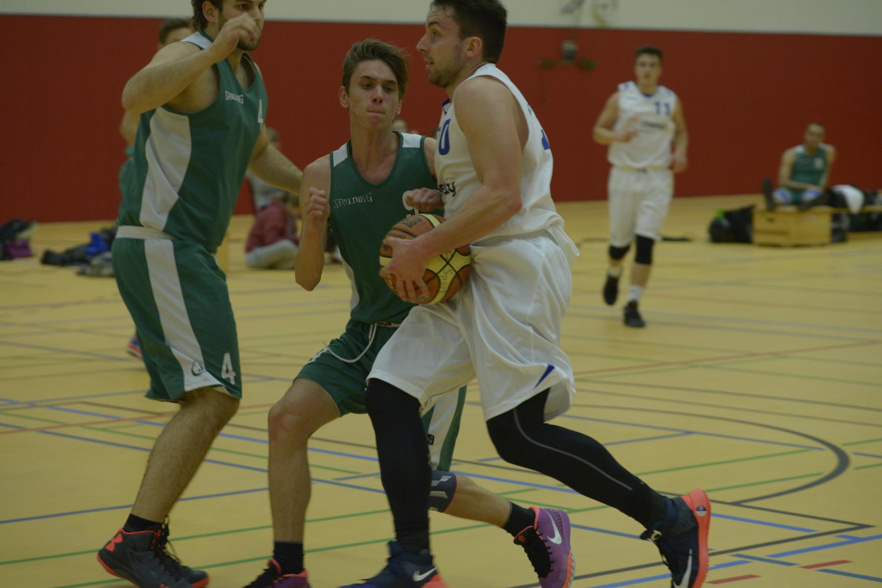Basketballspiel: Zwei Spielerinnen kämpfen um den Ball, während ein Spieler der gegnerischen Mannschaft unterstützt.