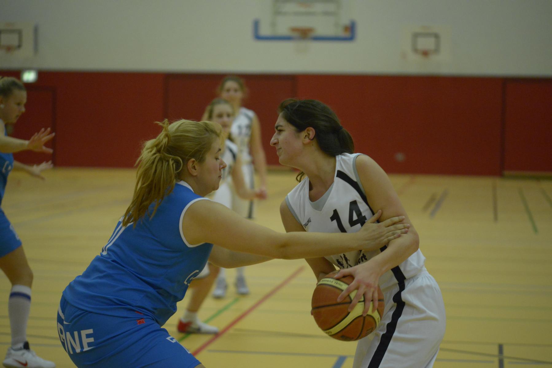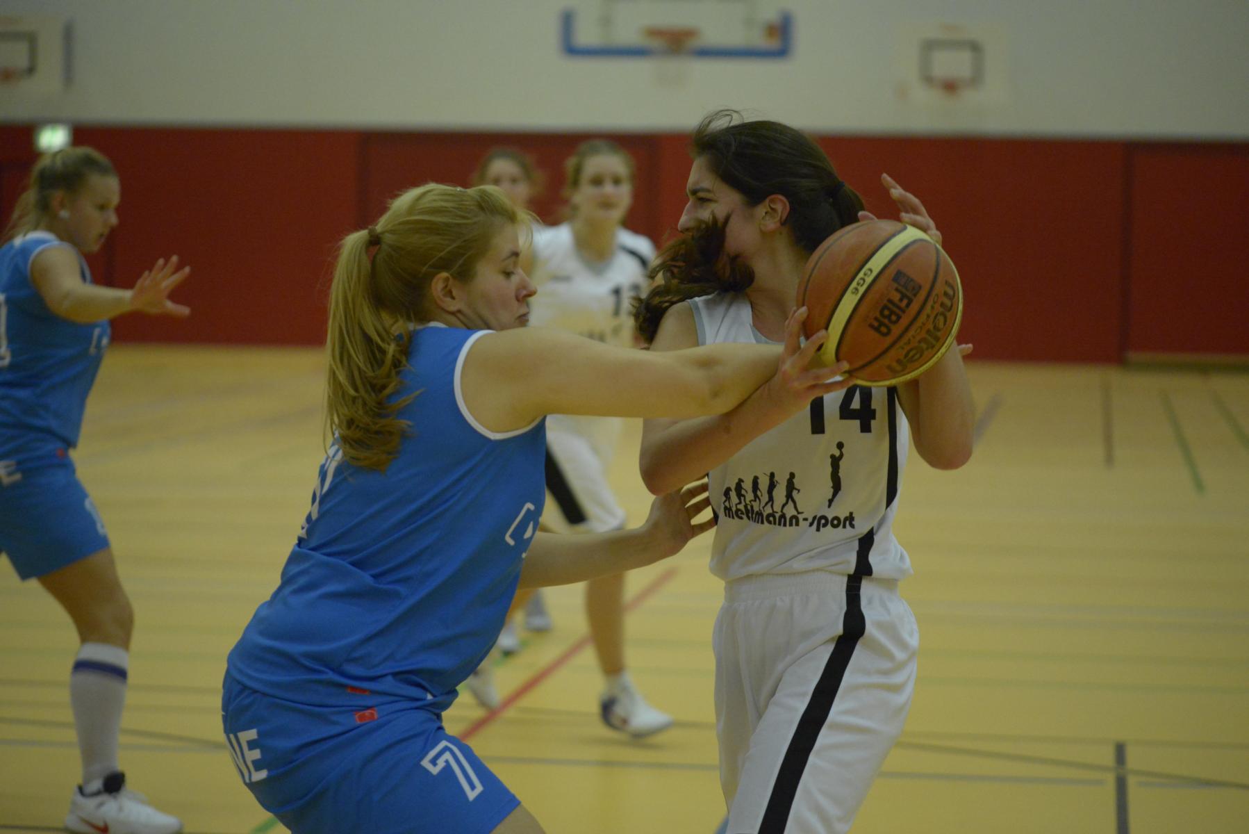 Zwei Basketballspielerinnen kämpfen um den Ball auf dem Spielfeld während eines Spiels in einer Sporthalle.