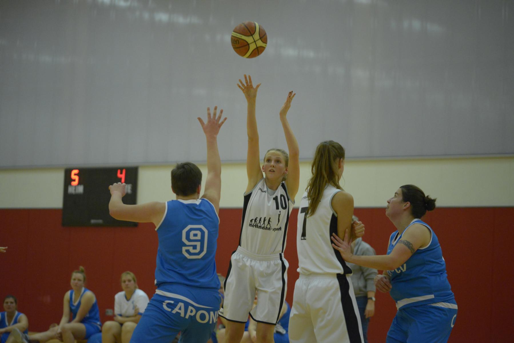 Spielerin in weißem Trikot wirft Ball während eines Basketballspiels, gegnerische Spielerinnen stehen in blauen Trikots.