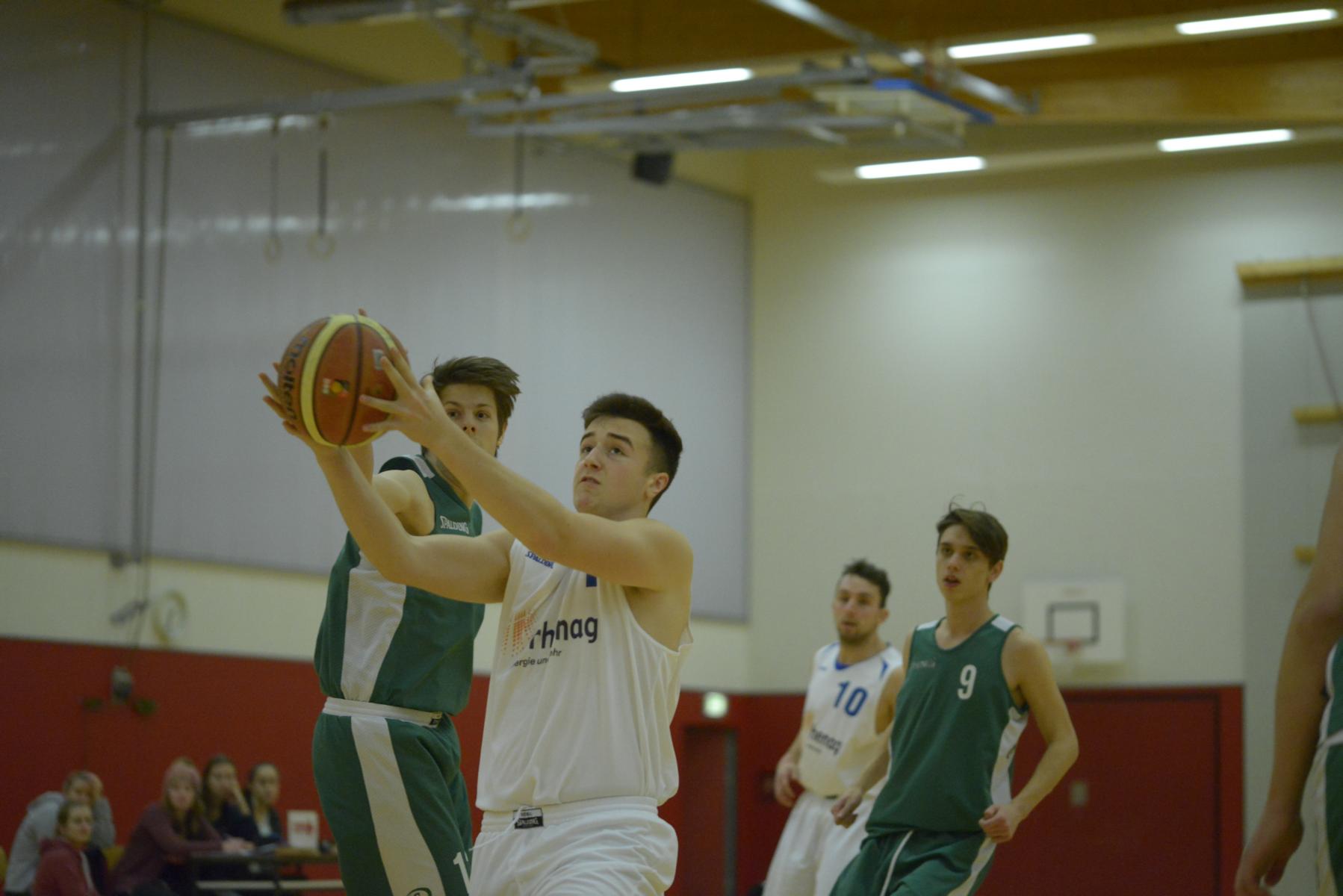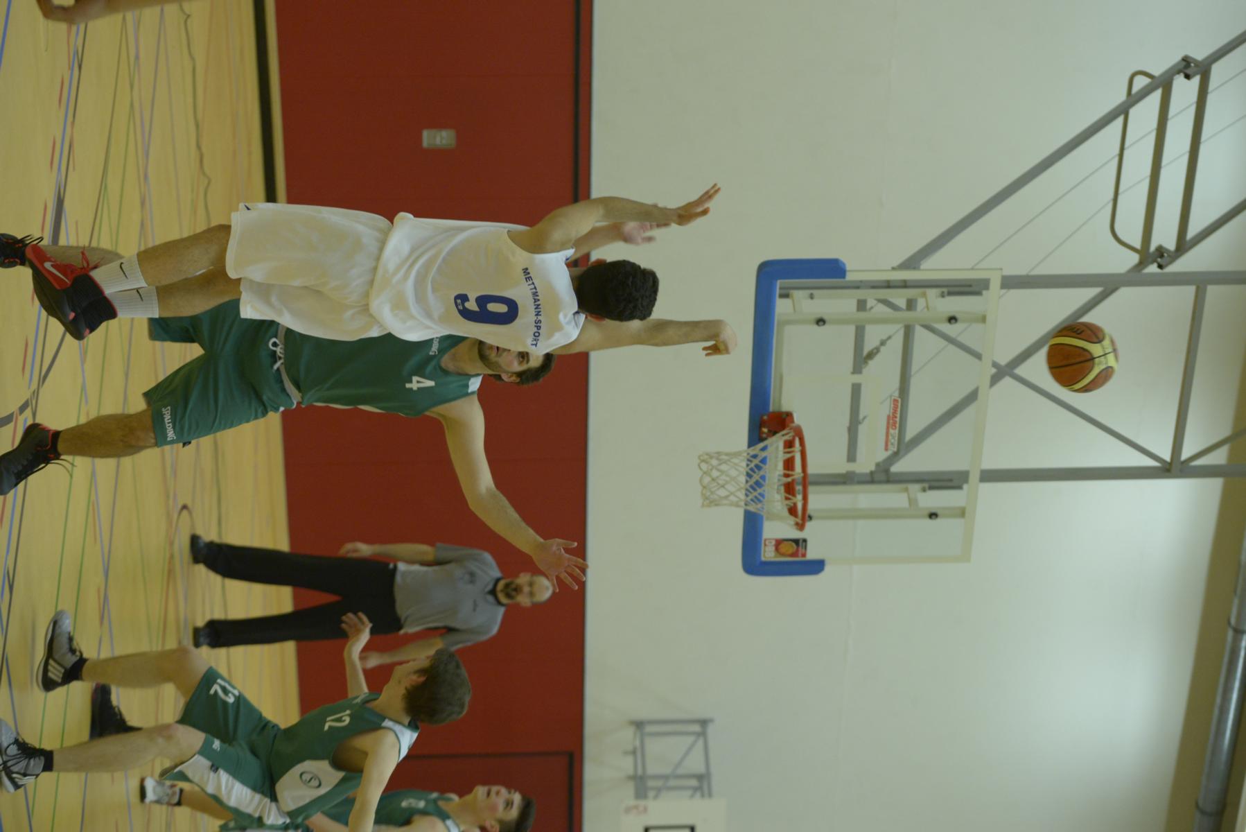 Zwei Basketballmannschaften befinden sich im Wettkampf auf dem Spielfeld, eine Spielerin hält den Ball.