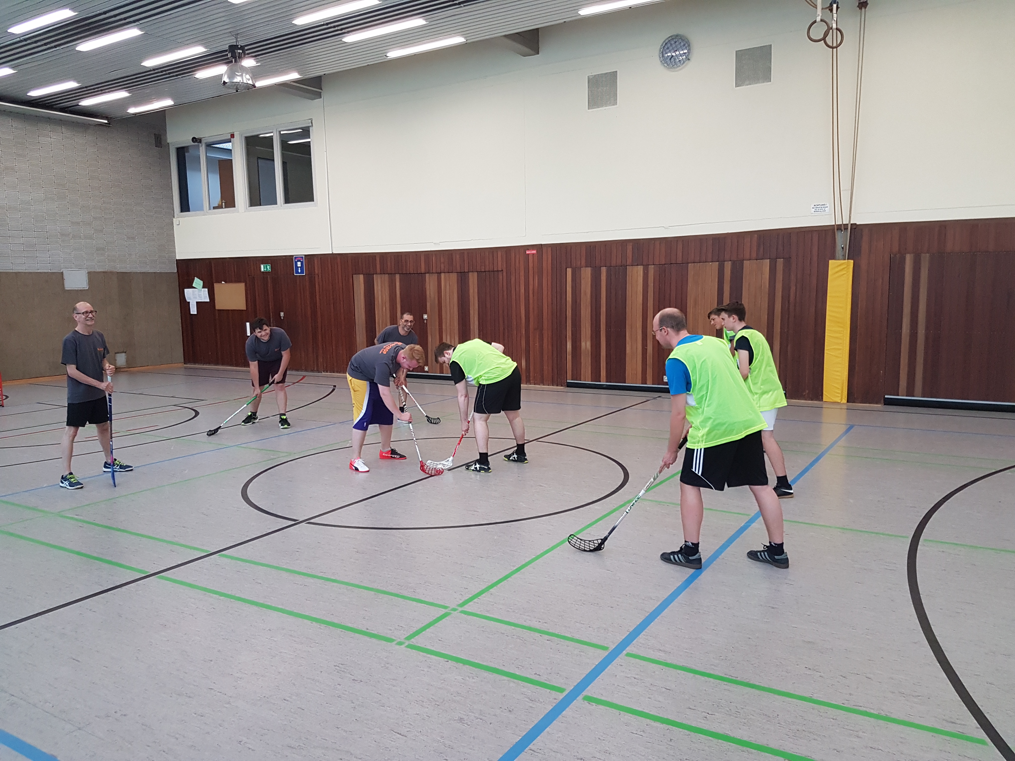 Gruppenübung in einer Sporthalle mit acht Personen, die Floorball spielen, einige in Neonwesten.