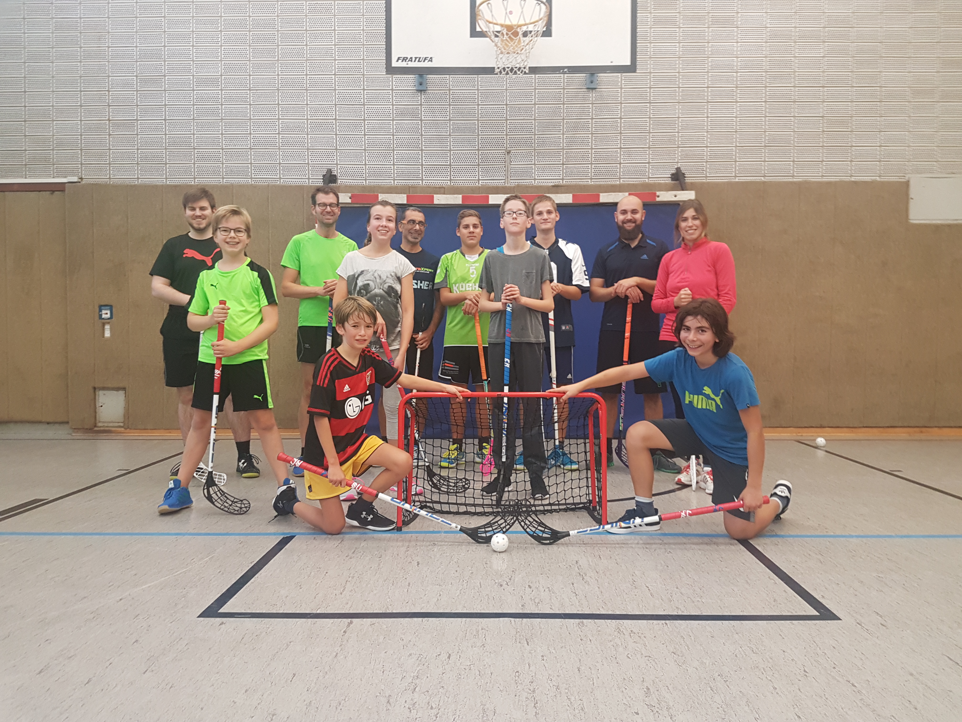 Gruppenshot von Jugendlichen und Erwachsenen mit Floorball-Schlägern vor einem Tor in einer Sporthalle.