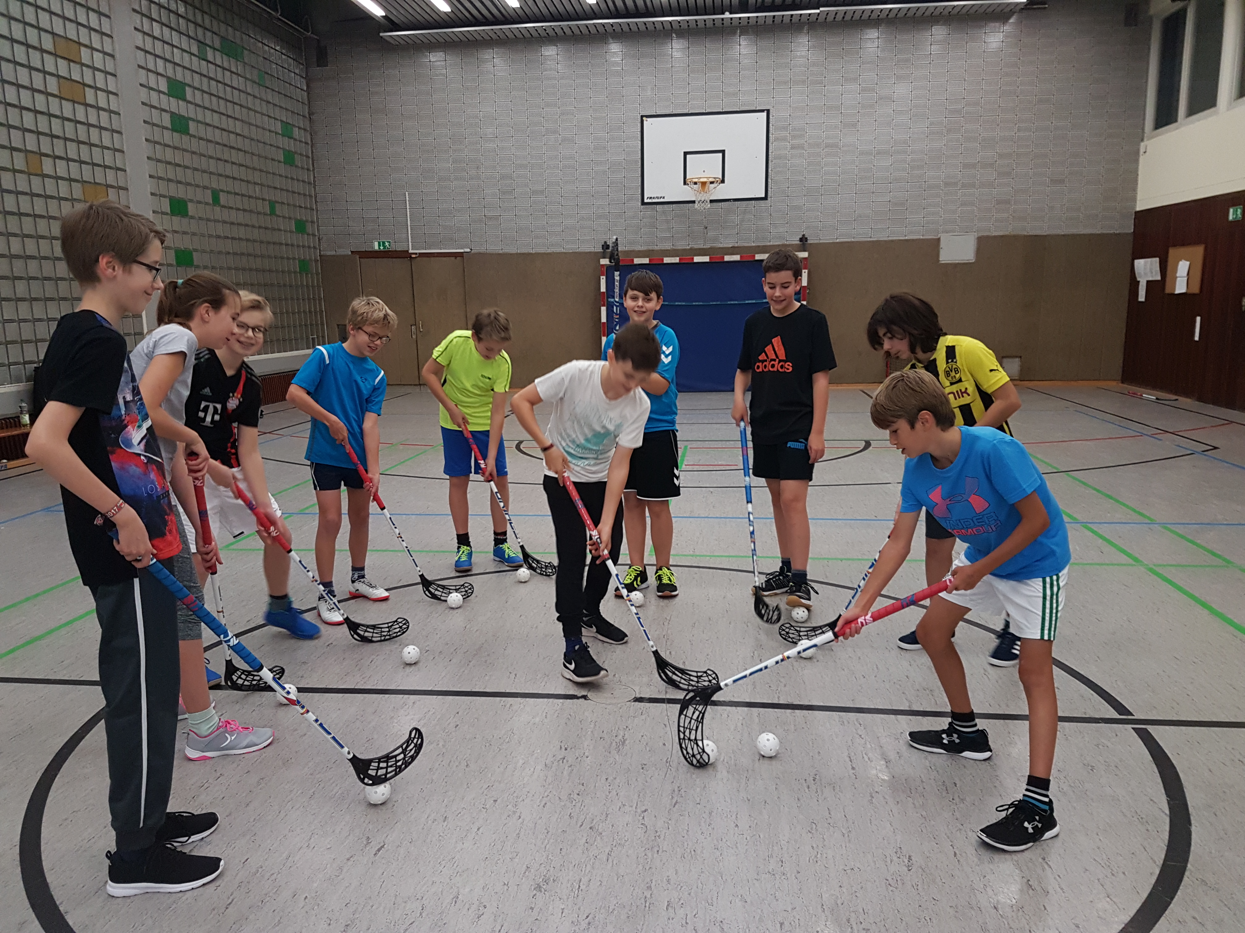 Gruppe von Kindern in Sportkleidung übt mit Hockeyschlägern und Bällen in einer Turnhalle.