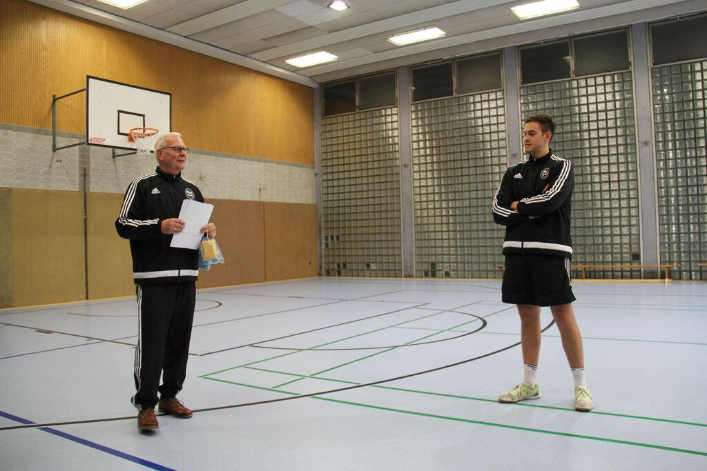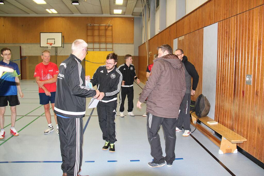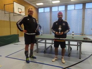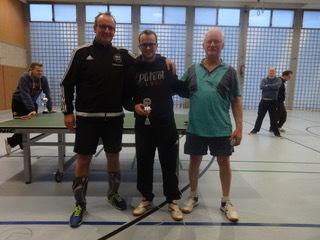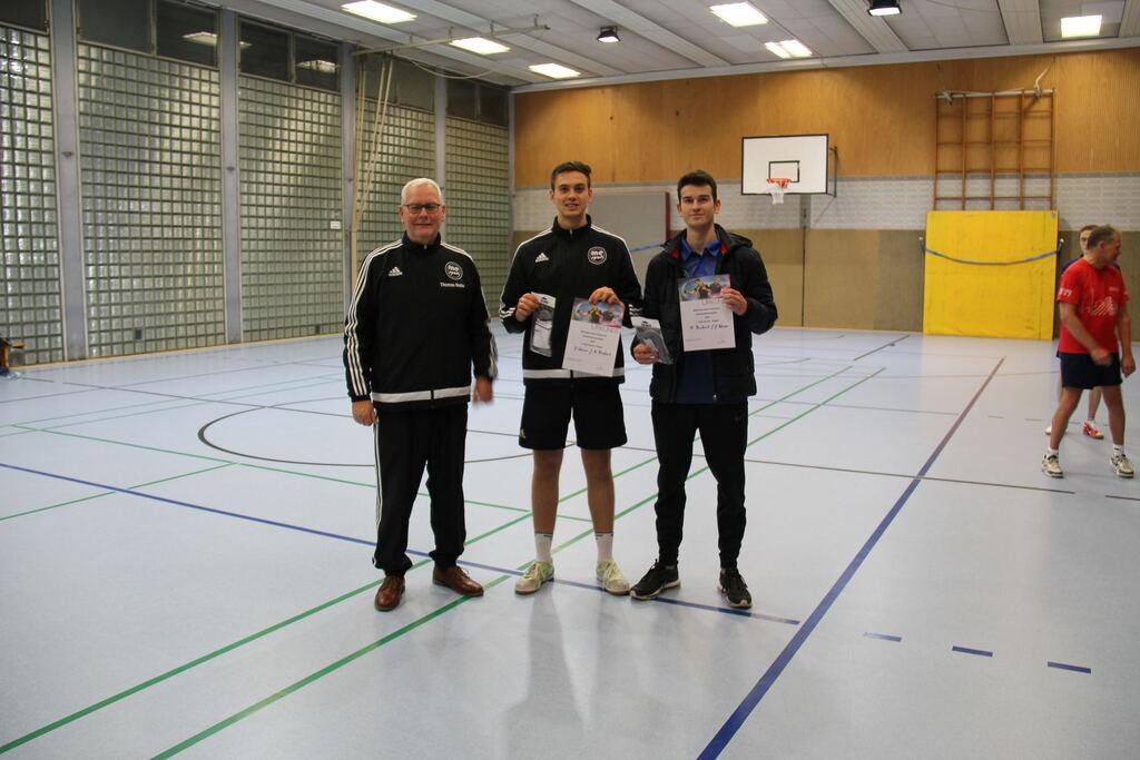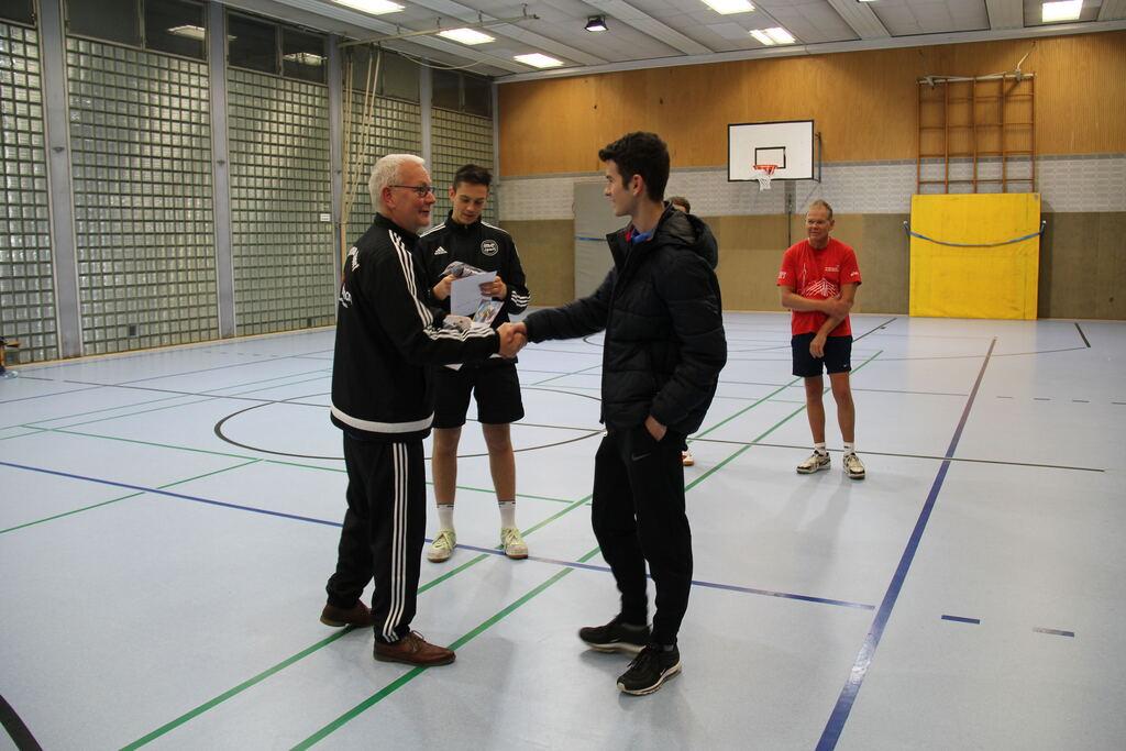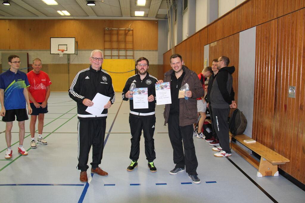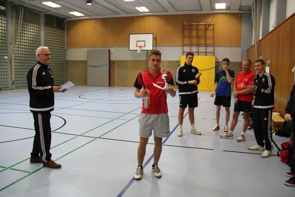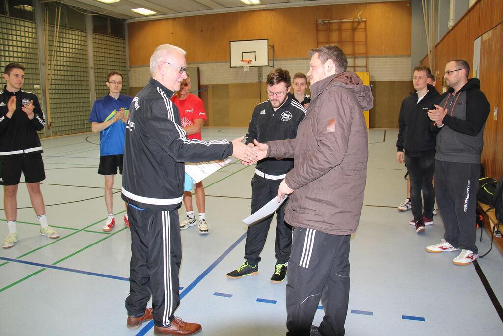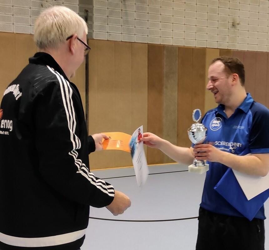 Der Abteilungsvorsitzende Thomas Nolte überreicht dem neuen Vereinsmeister Edgar Höhn Urkunde, Pokal und den Geldpreis.