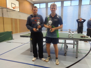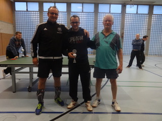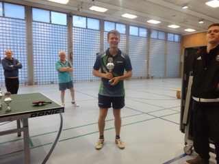 Der Abteilungsvorsitzende Thomas Nolte überreicht dem neuen Vereinsmeister Edgar Höhn Urkunde, Pokal und den Geldpreis.