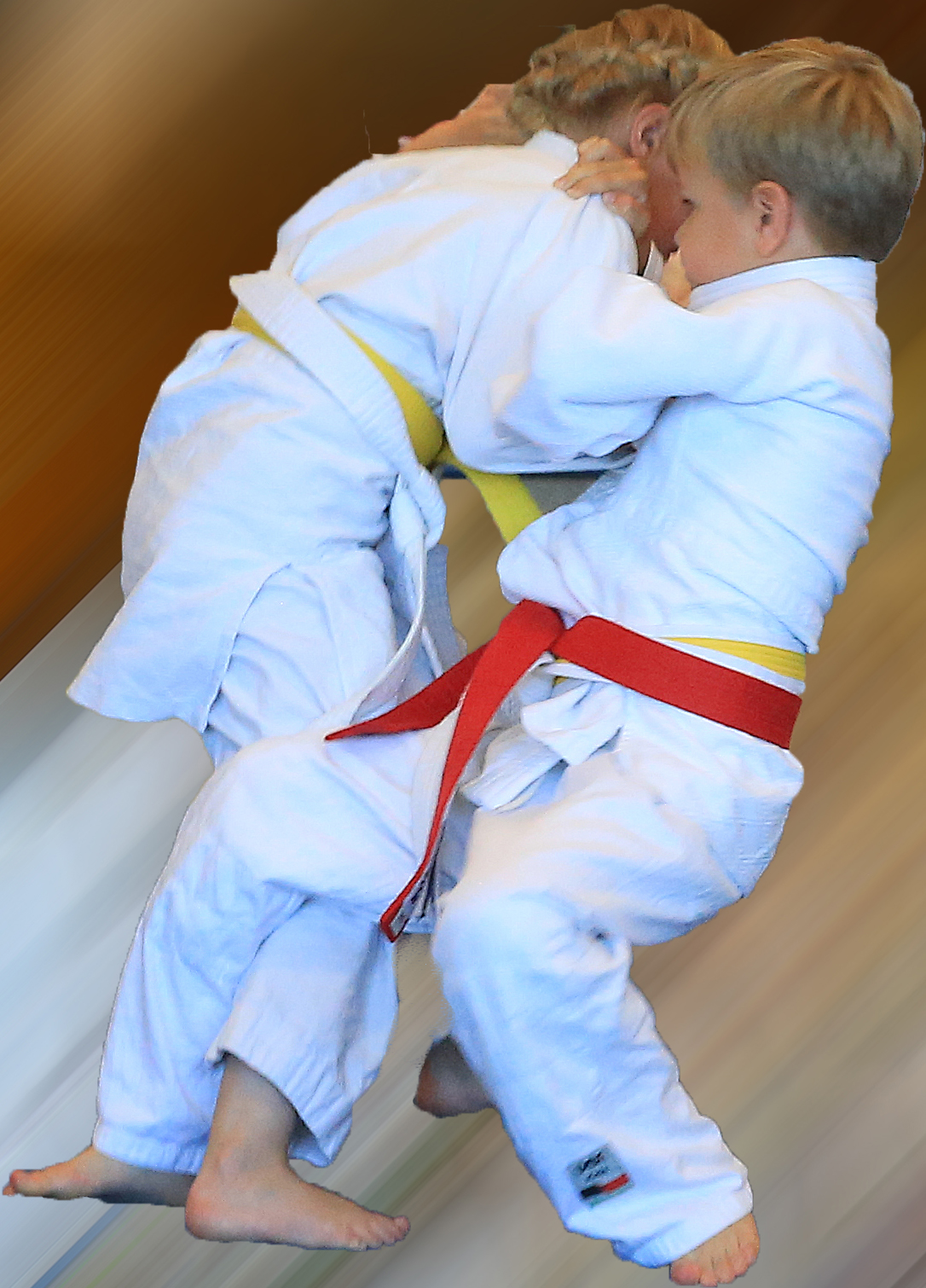 Zwei Kinder in Judogis üben einen Wurf, eins mit grünem, das andere mit rotem Gürtel. Download