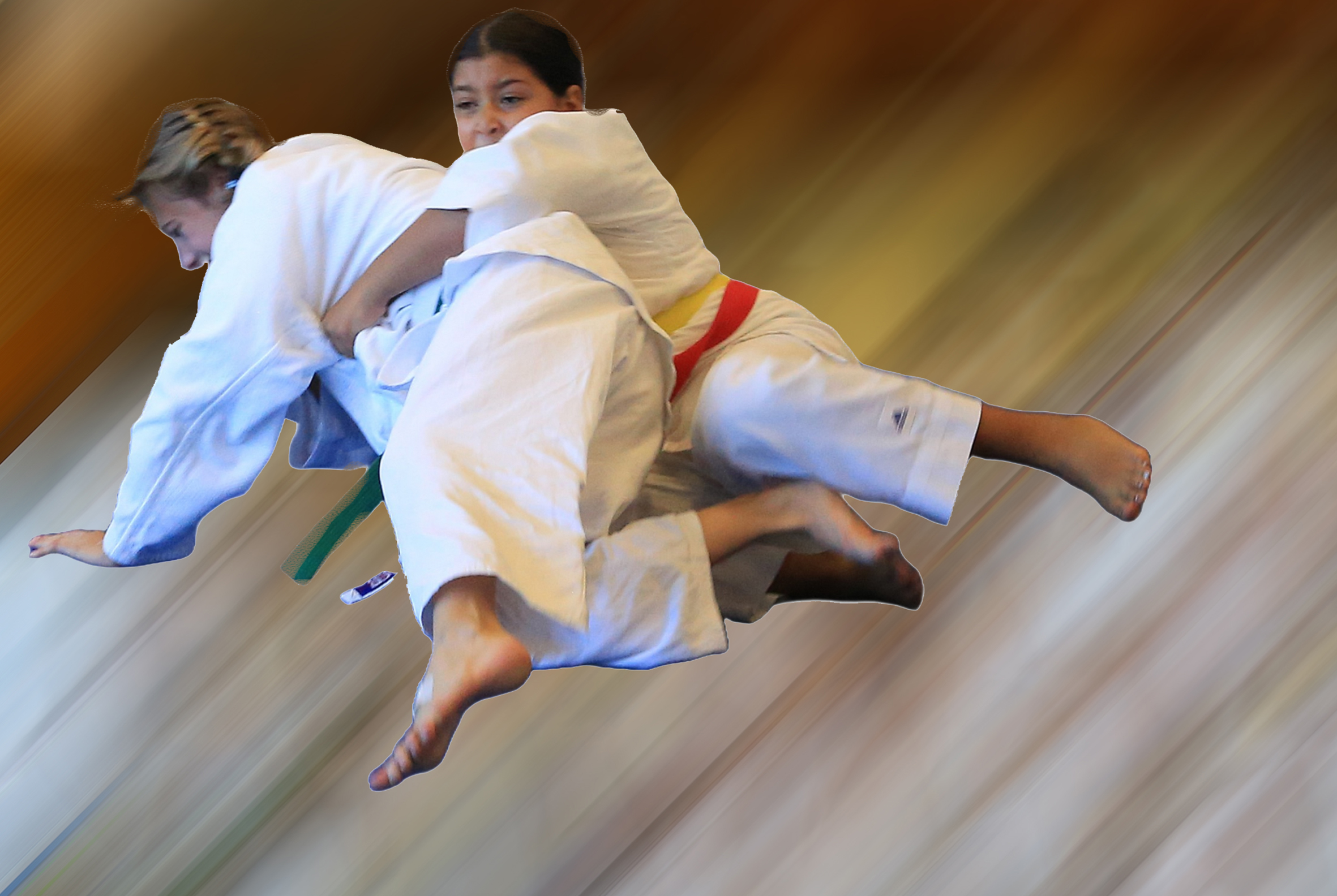 Zwei Kinder in Kampfanzügen führen einen Wurf im Judo aus, mit unscharfem Hintergrund, der Bewegung suggeriert. Download