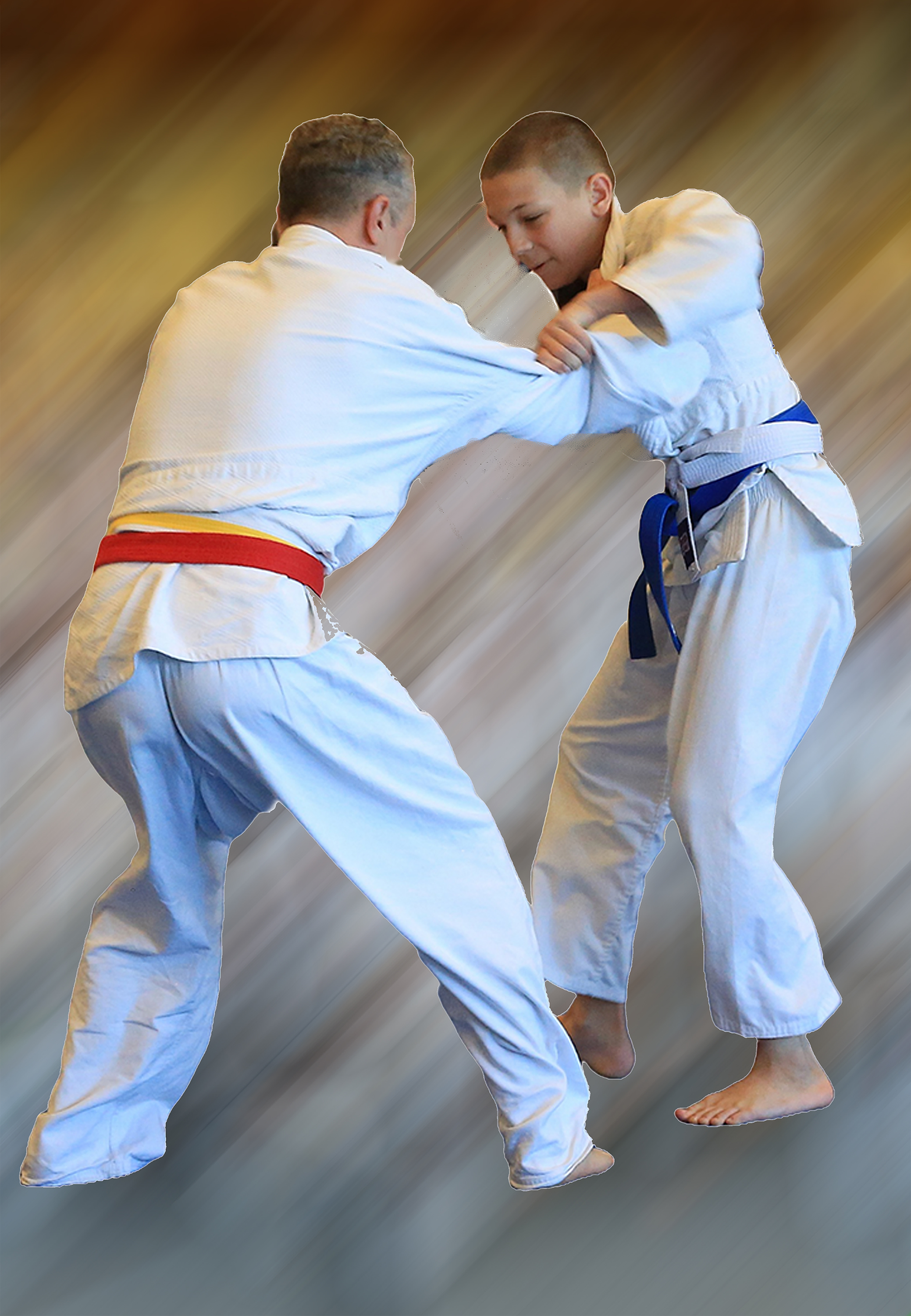Zwei Judokas in weißen Anzügen üben einen Wurf, einer trägt einen blauen, der andere einen roten Gürtel. Download