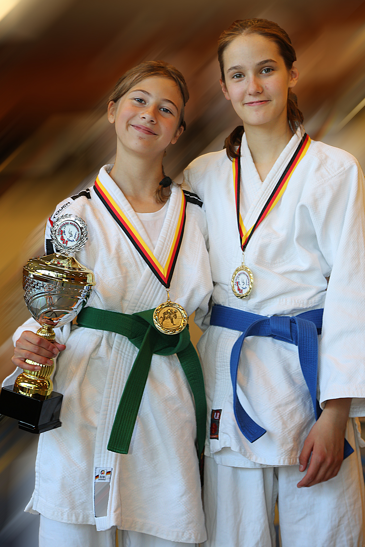 Zwei junge Mädchen in Judogis posieren mit einem Pokal und Medaillen, eine mit grüner, die andere mit blauer Gürtelfarbe. Download