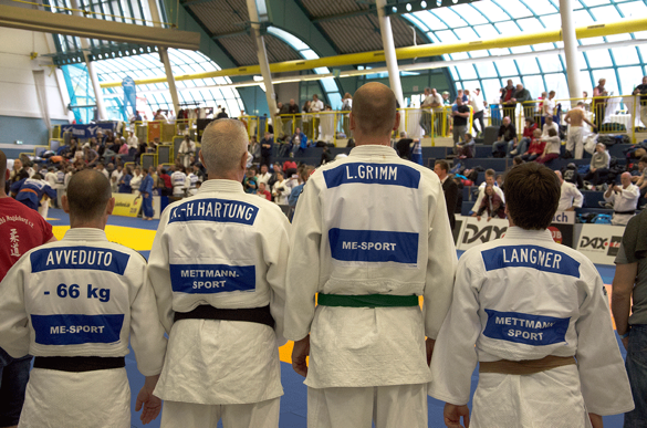 Vier Judokas stehen Rücken an Rücken, in weißen Anzügen mit blauen Namensschildern auf einer Wettkampfmatte. Download
