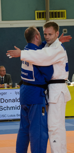 Zwei Judoka in Wettkampfkleidung kämpfen, einer greift den anderen von hinten an, dynamische Bewegungen, Unschärfe im Hintergrund. Download