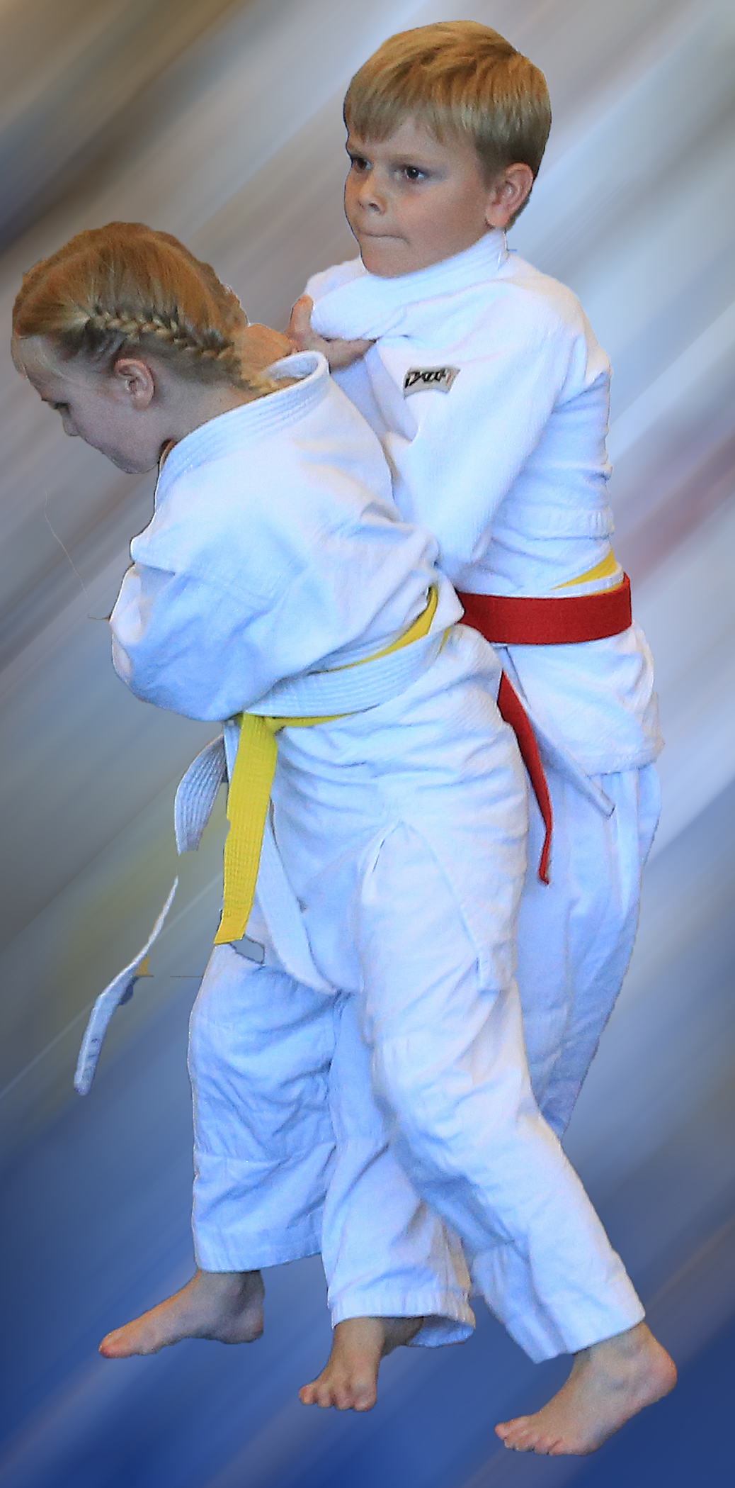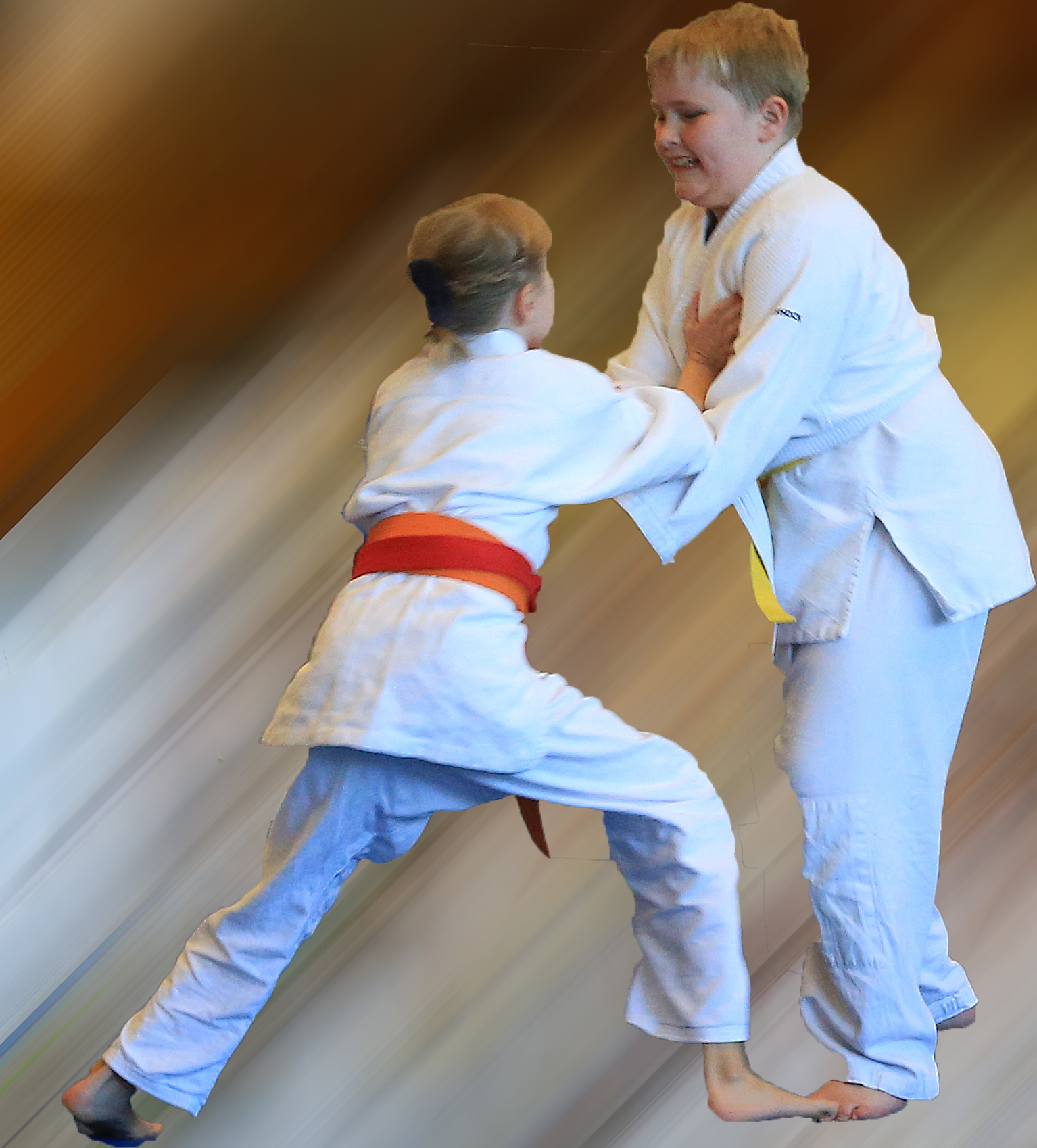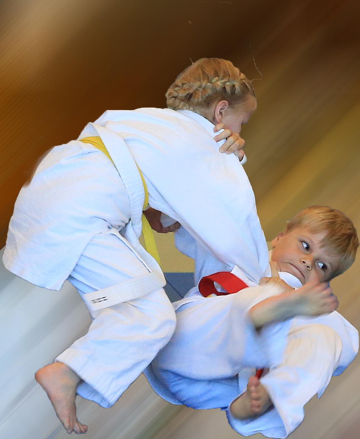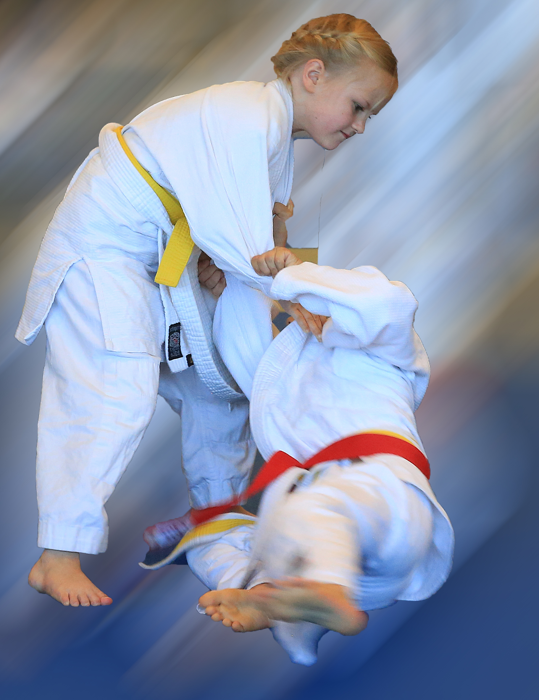 Zwei Kinder im Judoanzug kämpfen im Sprung, die eine mit rotem, die andere mit orangefarbener Gürtelfarbe. Download