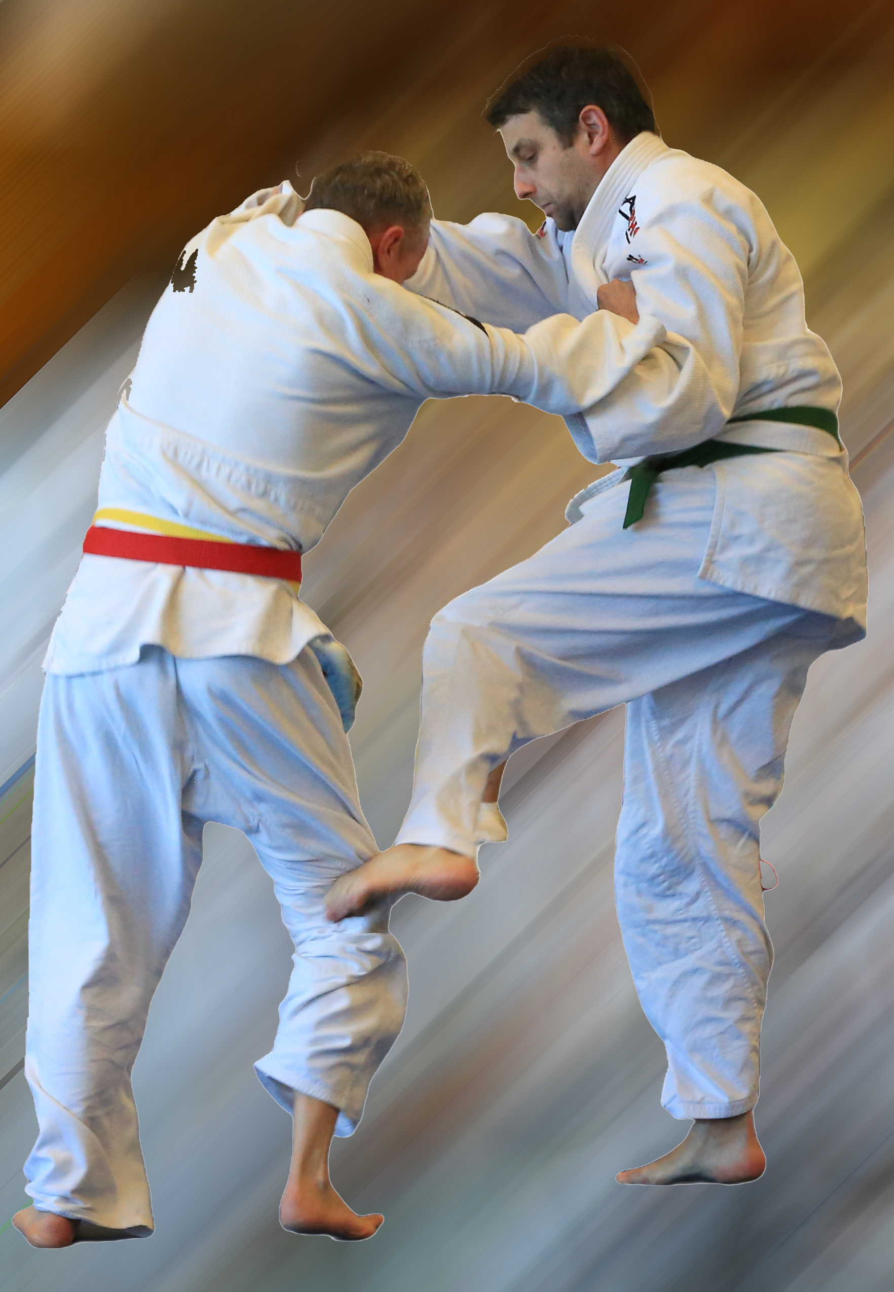 Zwei Judokas in Weiß kämpfen, der eine hebt ein Bein, während der andere seinen Griff hält. Bewegungsunschärfe im Hintergrund. Download