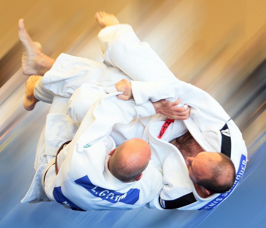 Zwei Judoka in weißen Anzügen kämpfen am Boden, einer greift den anderen an und hält ihn in einem Griff. Download